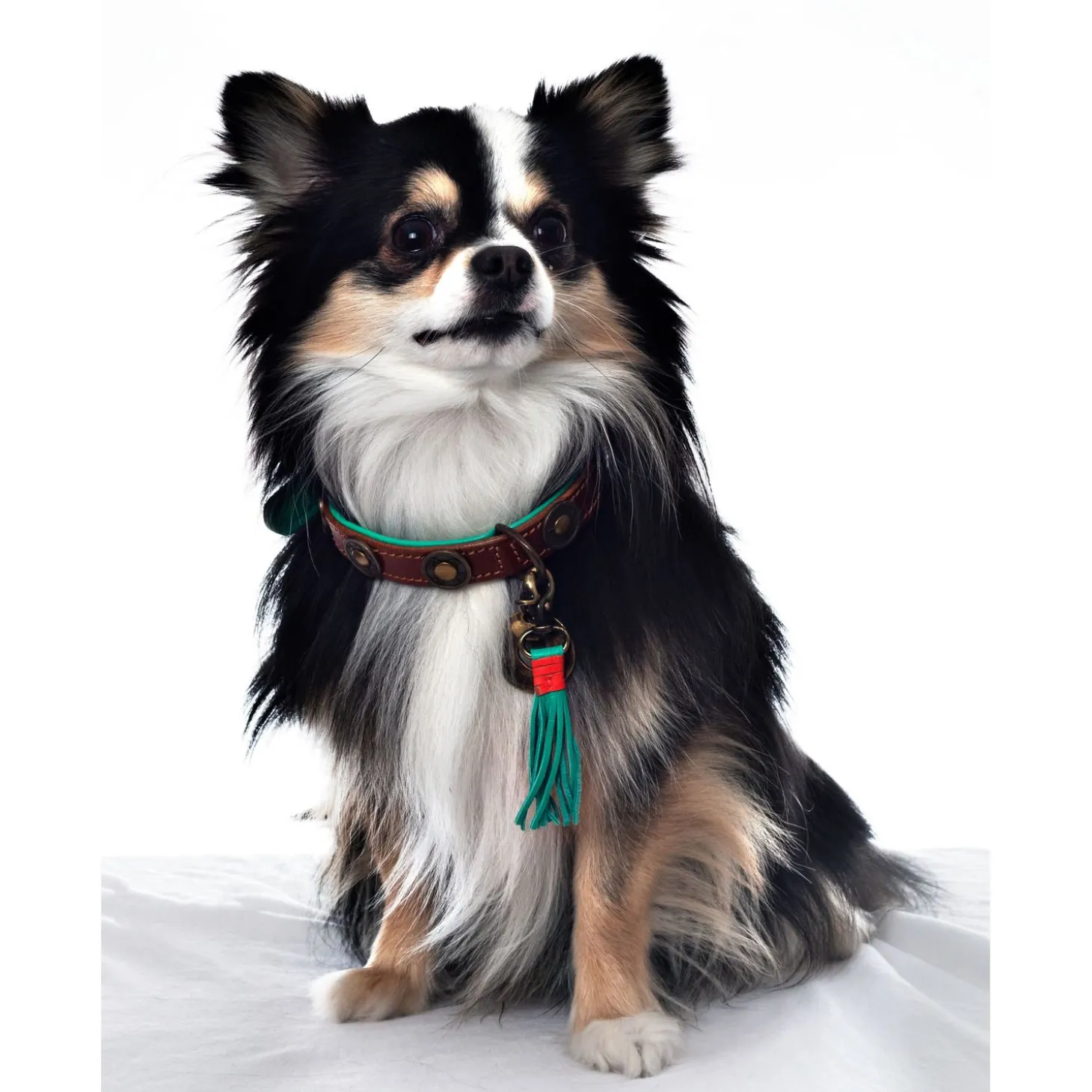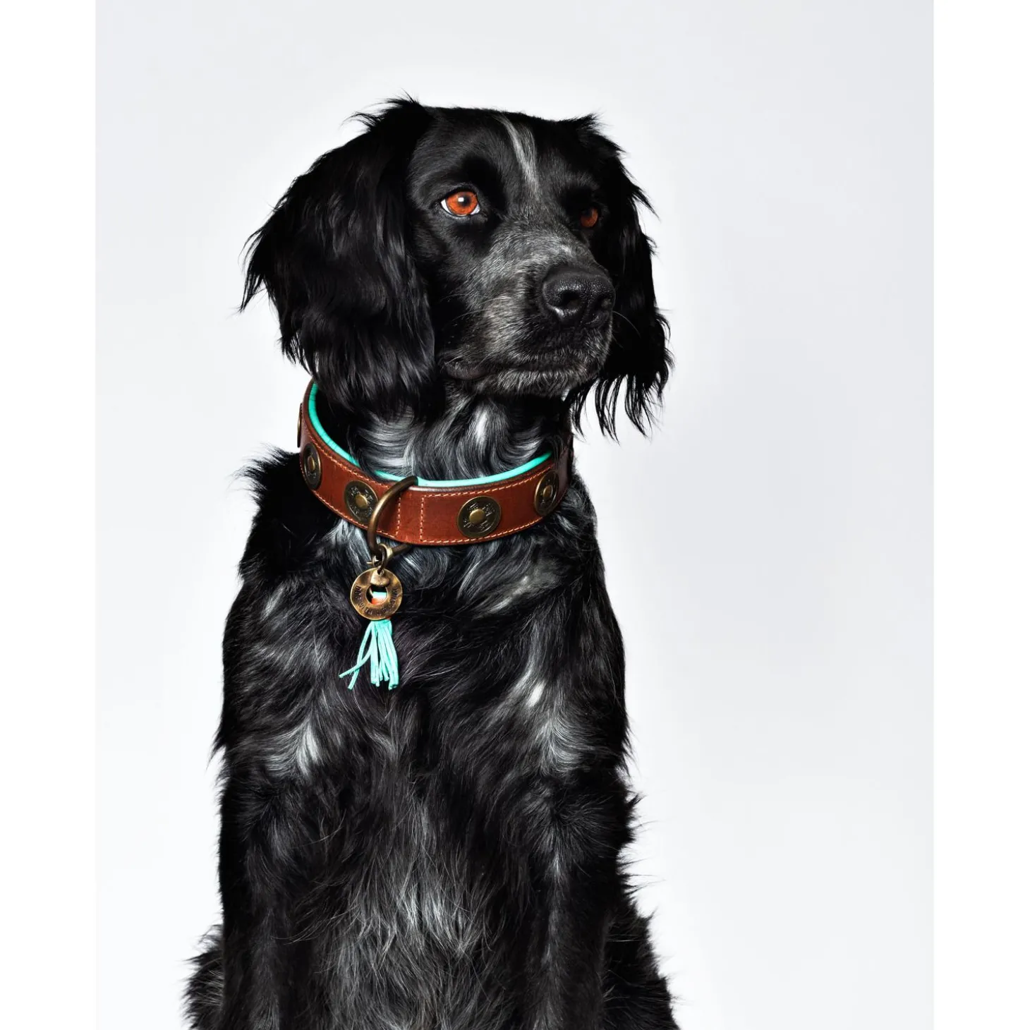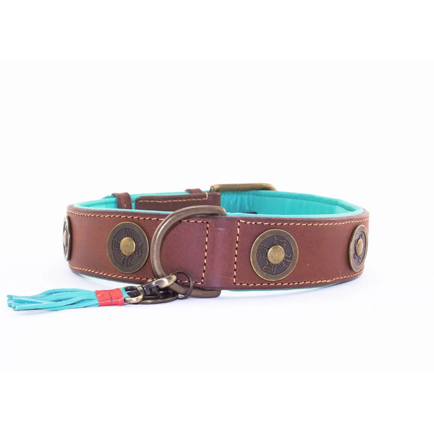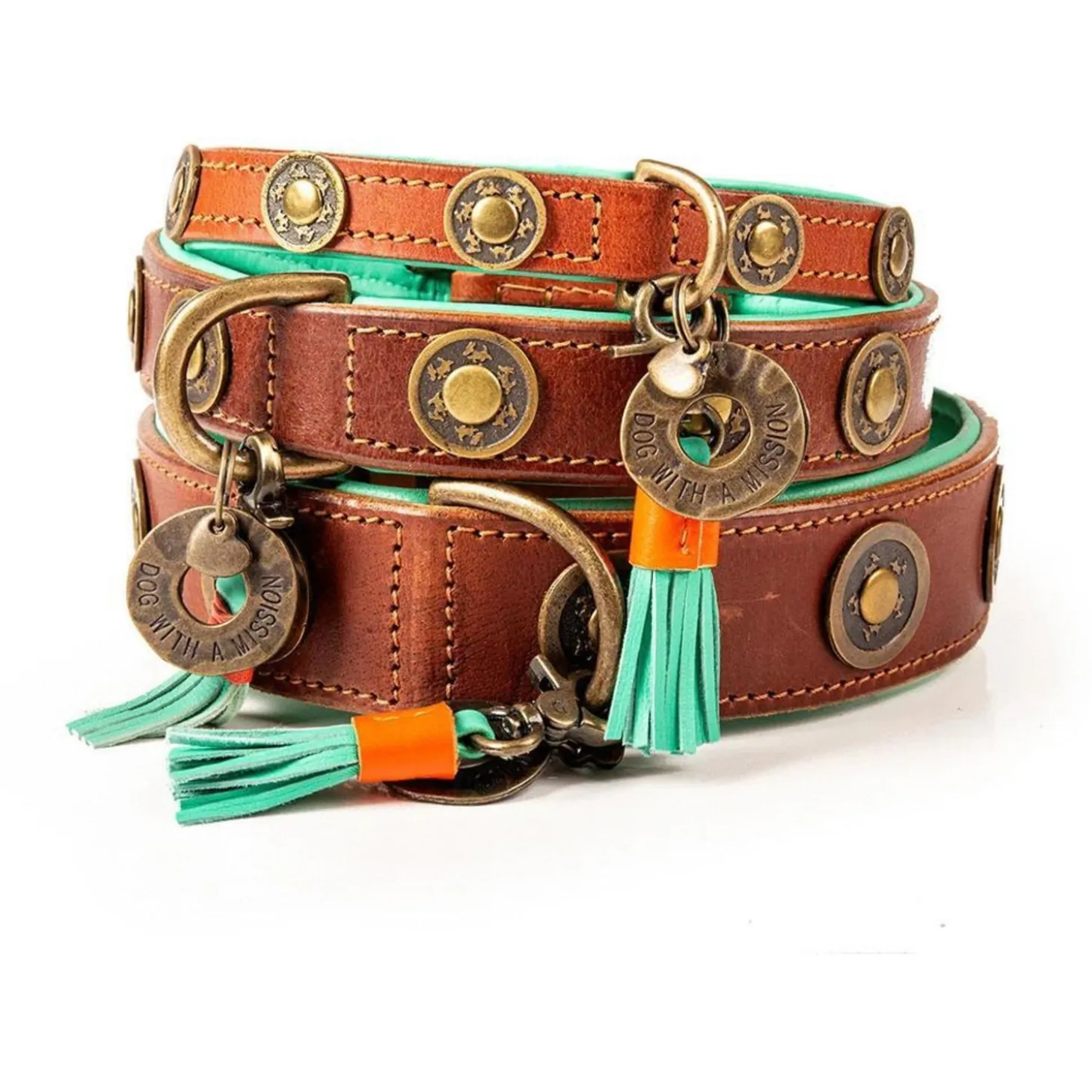 Wanneer je op pad gaat met je hond, wil je er natuurlijk wel flitsend uitzien. DWAM heeft een assortiment met prachtige riemen en halsbanden waarmee je hond er altijd stijlvol bij loopt. De Urban van Dog With A Mission is een handgemaakte, oersterke halsband voor je viervoeter. De Urban is gemaakt van tuigleer met een turquoise binnenkant en met decoratieve munten aan de buitenkant. De halsband wordt afgemaakt met een bedeltje.