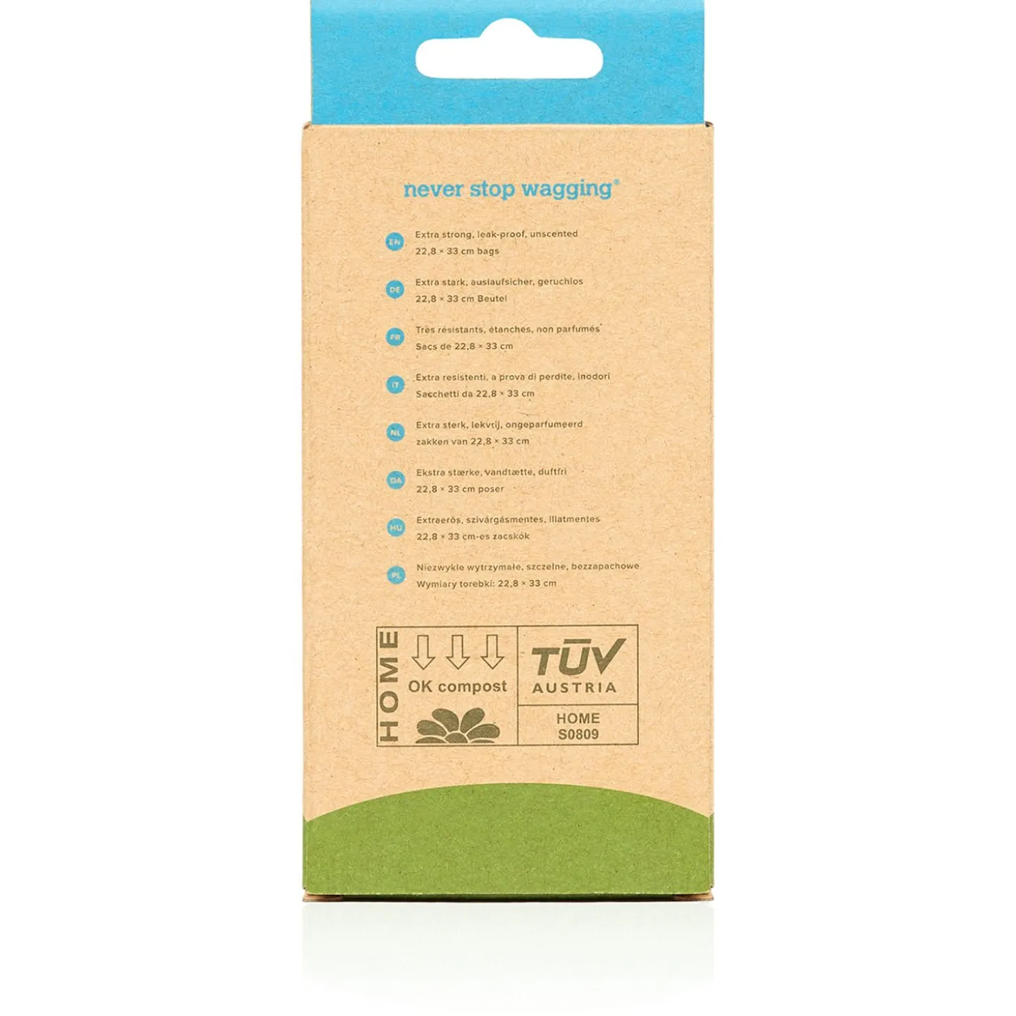 De Earth Rated zakjes zijn lekvrij, van hoge kwaliteit en zijn zeer betaalbaar. Ook aan het milieu is gedacht, de kartonnen binnenrollen en de verpakking zijn gemaakt van gerecycled materiaal. De rollen passen in standaard riemdispensers en uiteraard ook in de los verkrijgbare Earth Rated Houder.