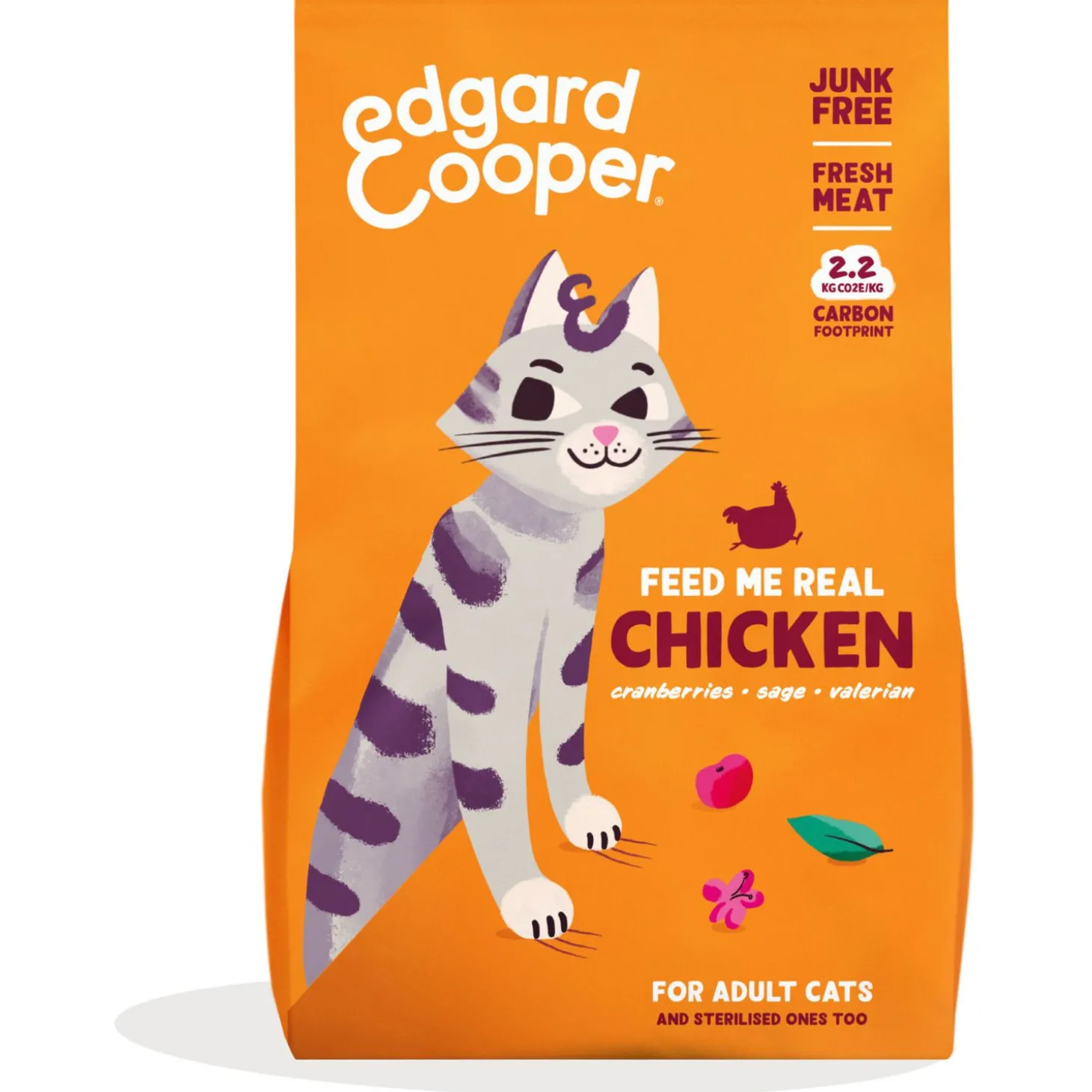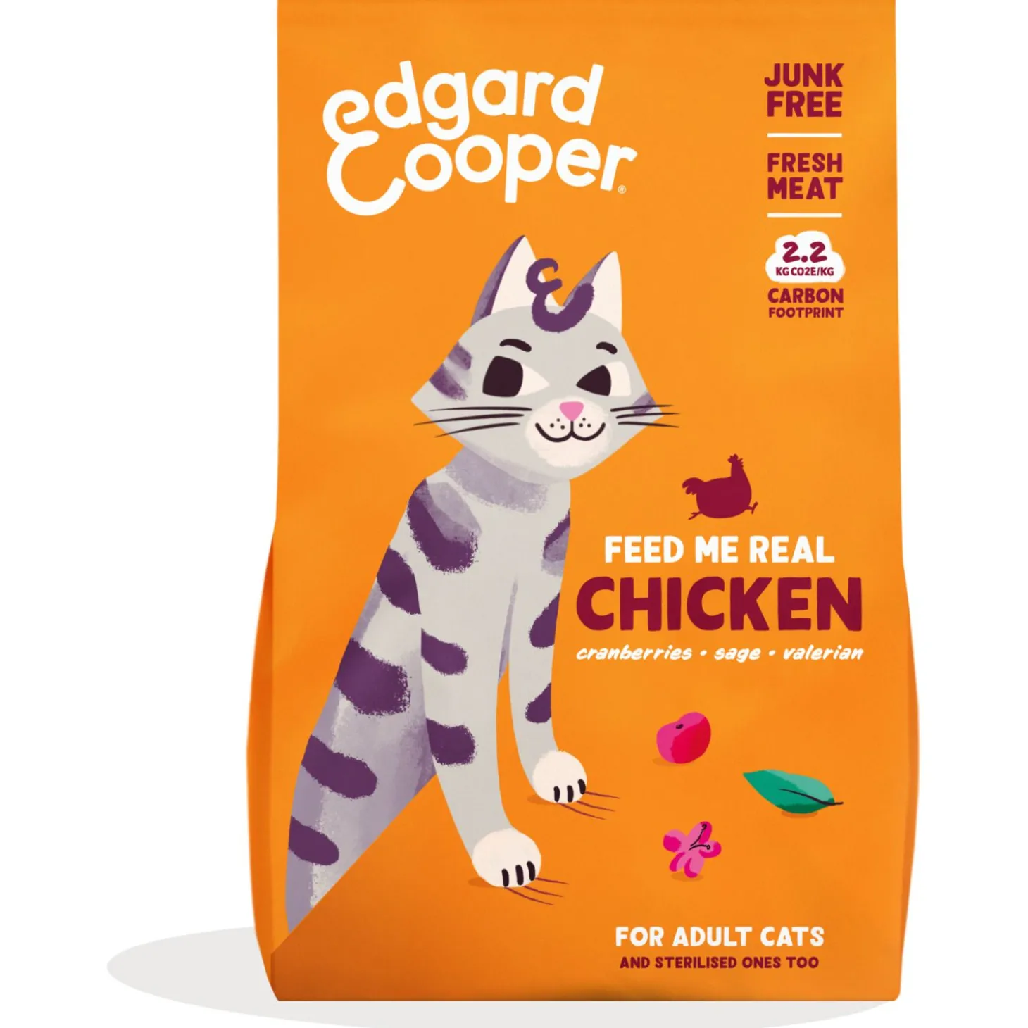 Omdat katten carnivoren zijn, bevatten alle voedingen van Edgard & Cooper minstens 60% eiwitrijk vlees. Dat wordt gecombineerd met een uitgebalanceerde mix van kruiden, bessen en botanicals, zoals in dit geval salie, valeriaan en cranberry’s.