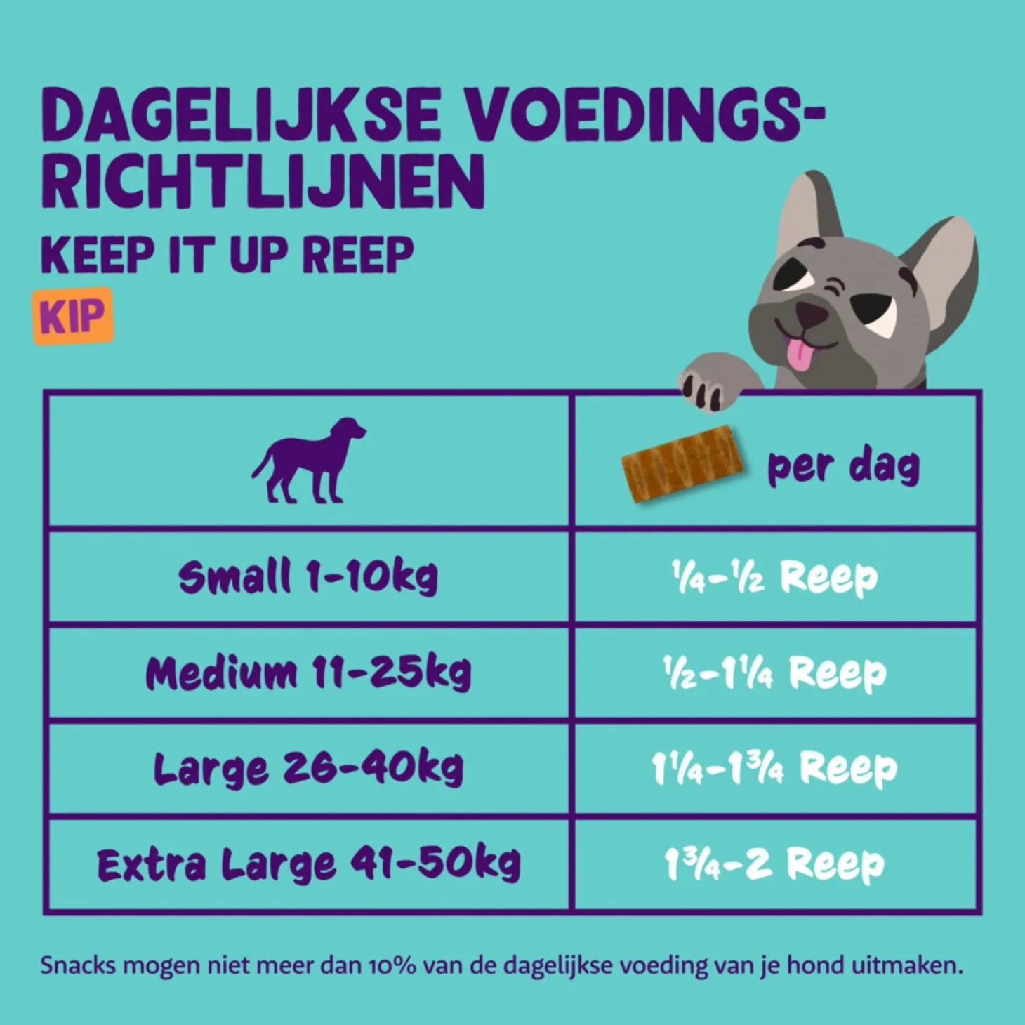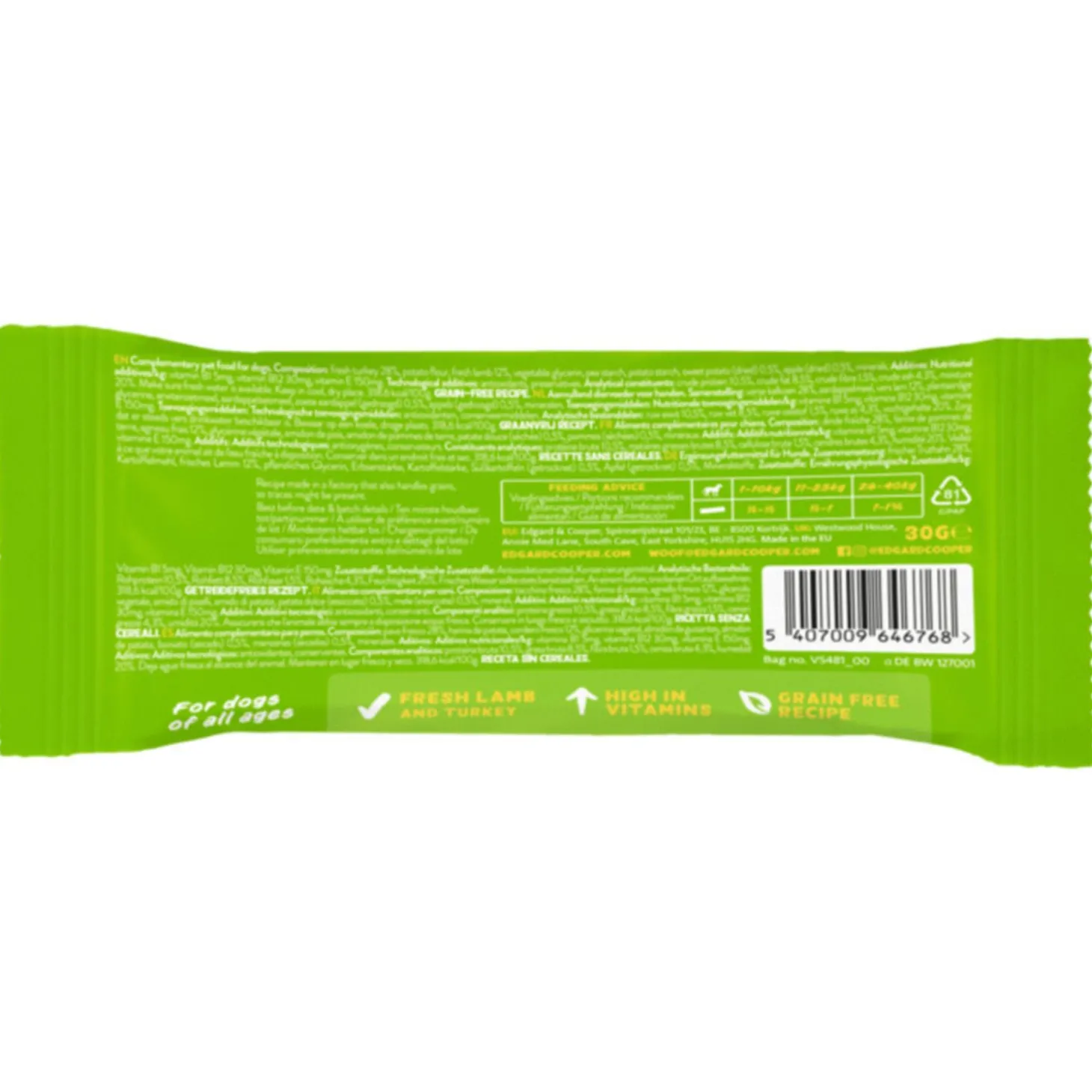 | Samenstelling | kip 84,5%, aardappel, glycerol (uit raapzaadolie), mineralen, appels 0,67%, cranberry’s 0,67%, wortels 0,67%. |