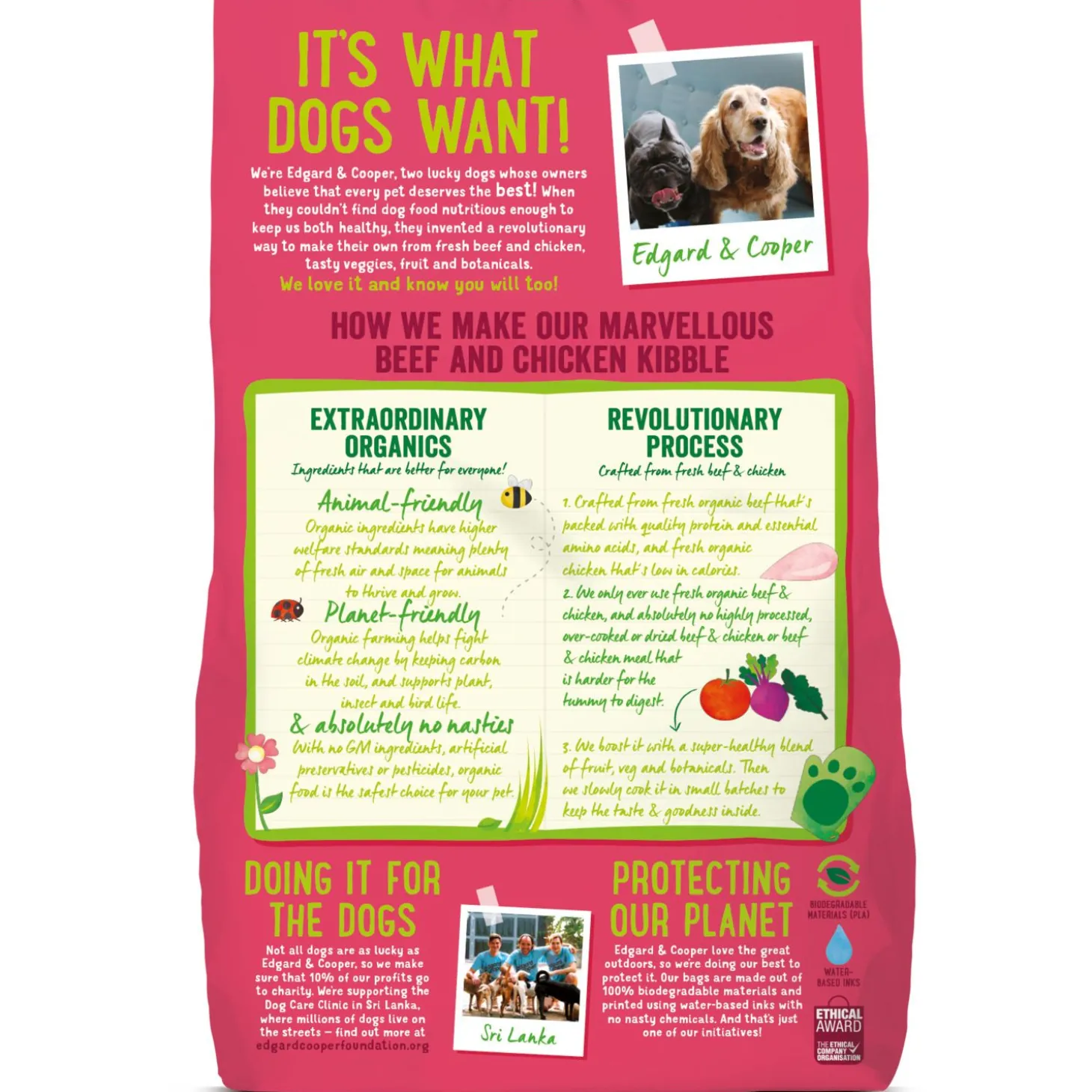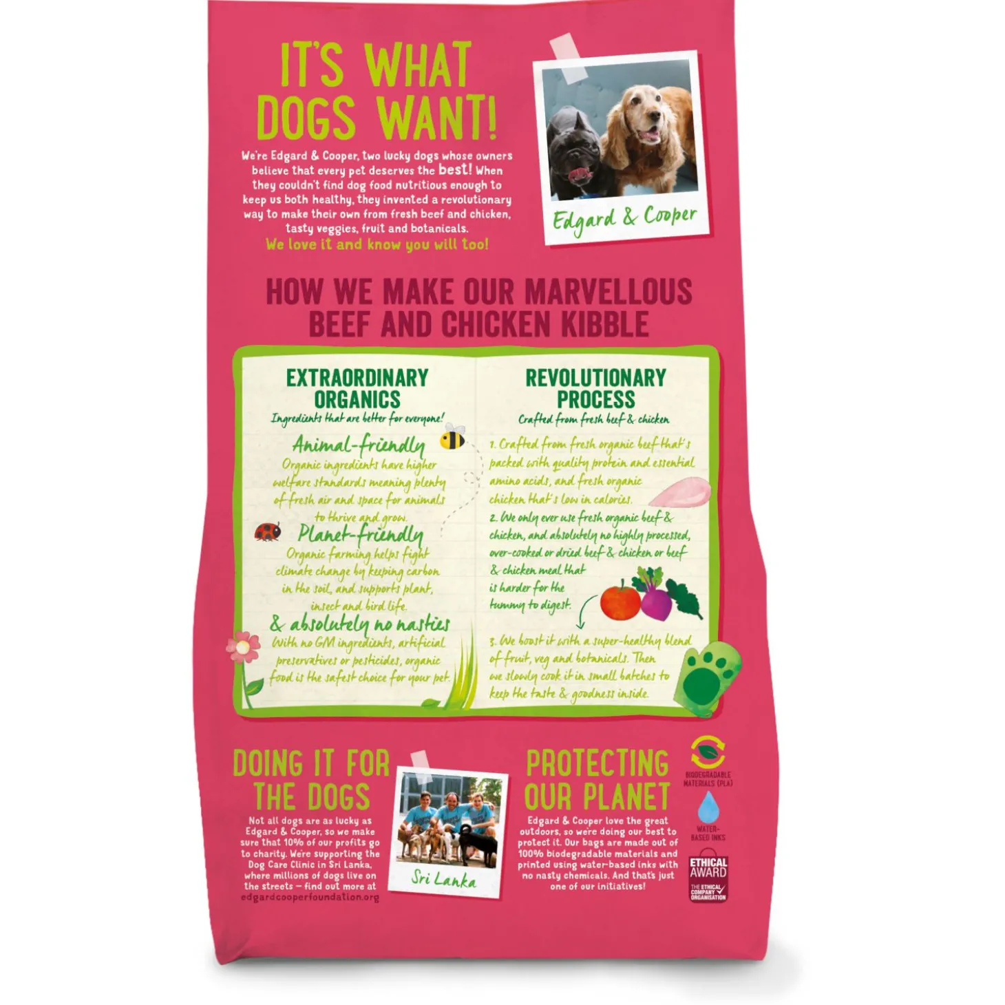 Edgard & Cooper vindt niet alleen gezonde huisdieren belangrijk, maar ook een gezonde planeet. De brokken zitten dan ook in een biologisch afbreekbare zak en daarnaast gaat 1% van de omzet naar een goed doel.