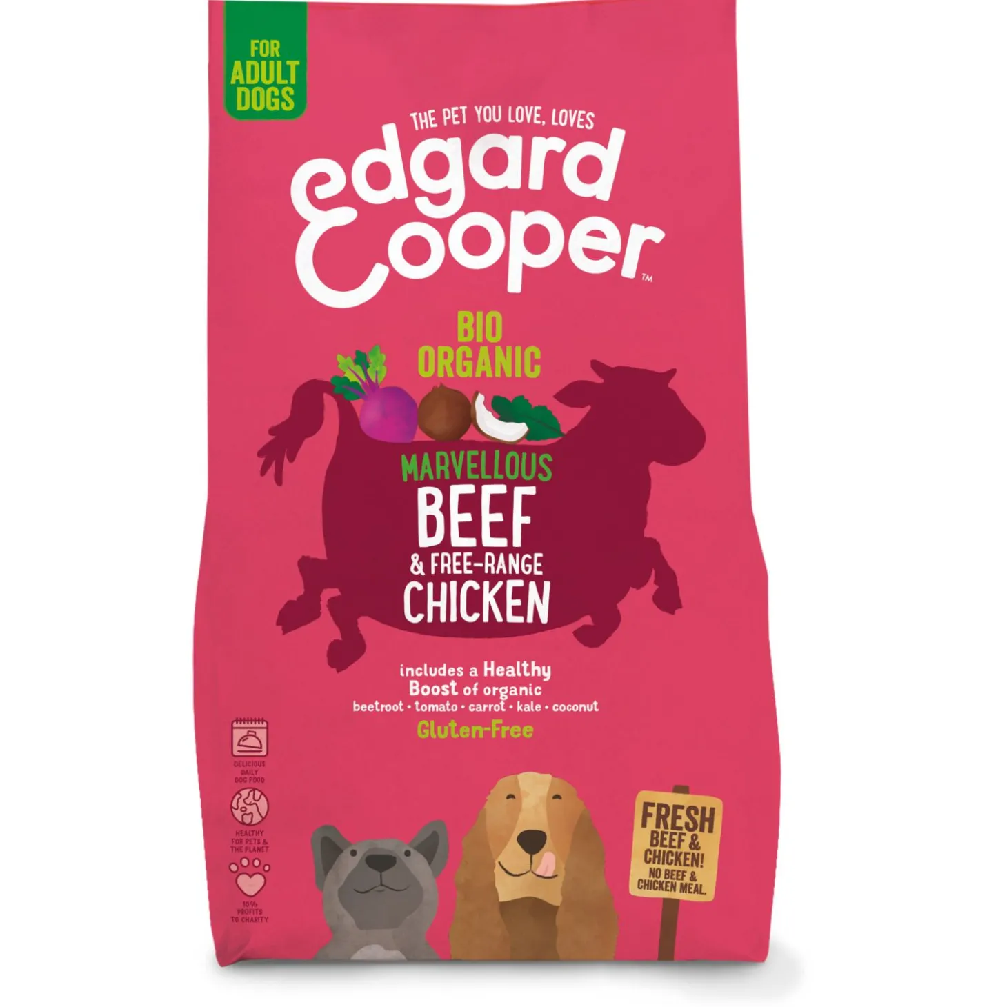 Deze heerlijke krokante en glutenvrije brok bevat verse biologische rund en biologische scharrelkip, zonder gedroogd of gedehydreerd vlees en boordevol kwalitatieve eiwitten. Verder bevat de voeding prebiotica voor een gezonde darmflora, is de brok aangevuld met rode biet, boerenkool en kokosnoot en zorgen lekkere kruiden en botanicals voor een extra boost. De ingrediëntencombinatie wordt langzaam gebakken.