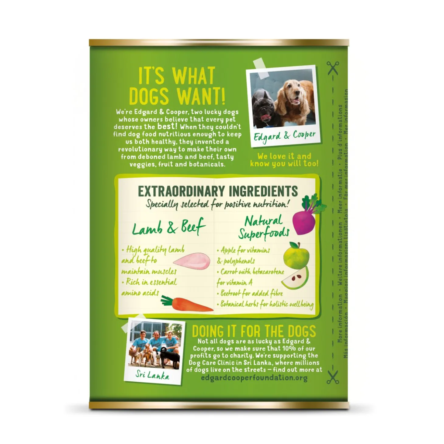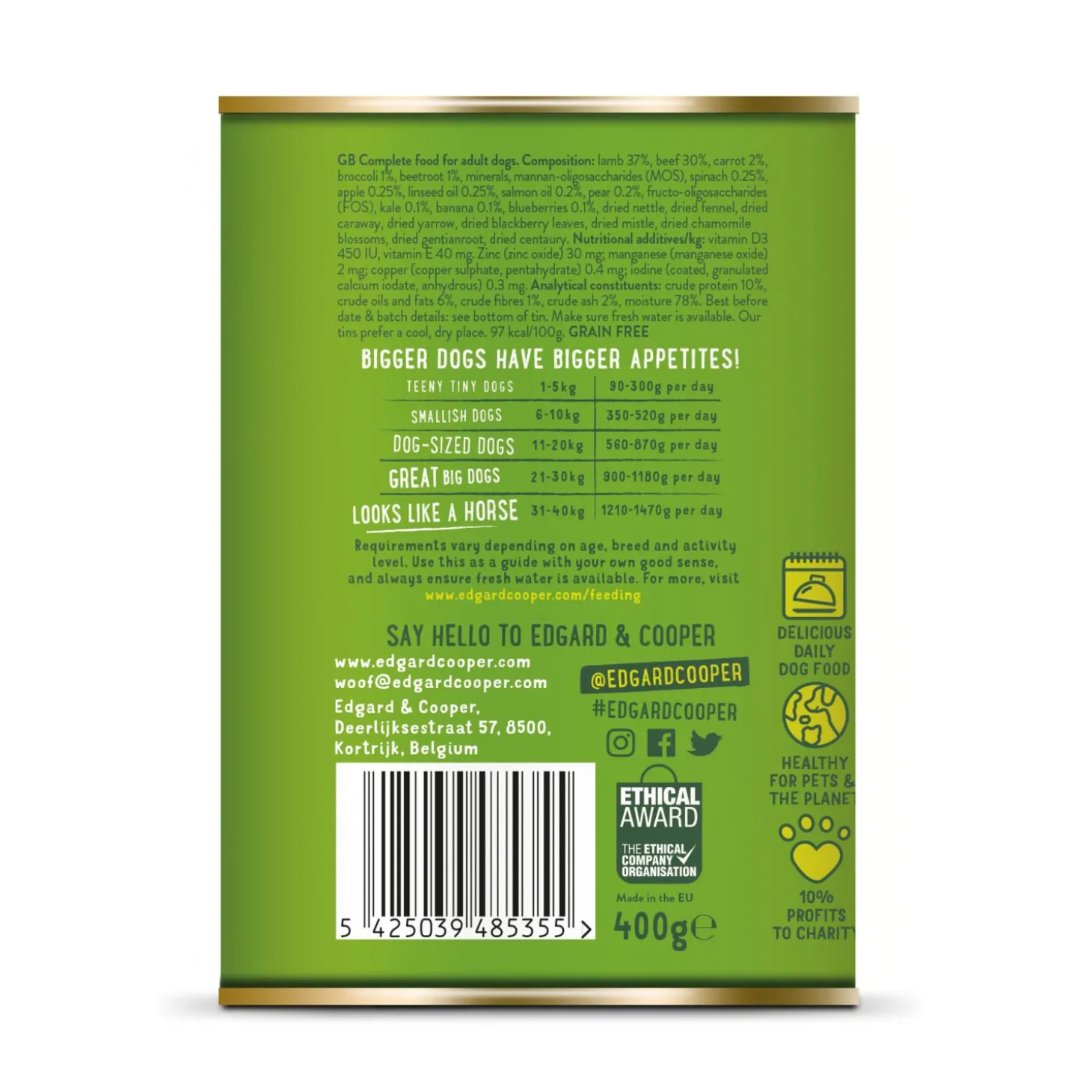 Edgard & Cooper vindt niet alleen gezonde huisdieren belangrijk, maar ook een gezonde planeet. De natvoeding zit dan ook in een recyclebaar blik en daarnaast gaat 1% van de omzet naar een goed doel.
