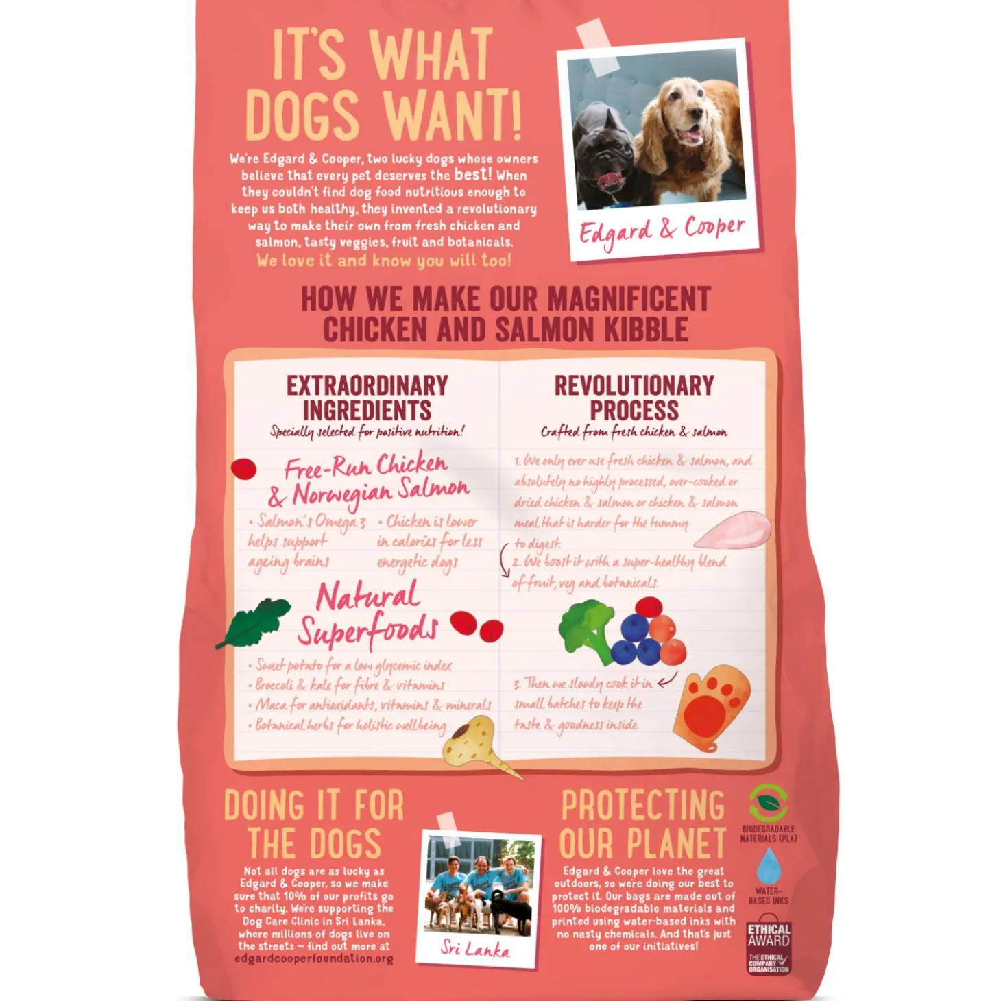 Edgard & Cooper vindt niet alleen gezonde huisdieren belangrijk, maar ook een gezonde planeet. De brokken zitten dan ook in een biologisch afbreekbare zak en daarnaast gaat 1% van de omzet naar een goed doel.