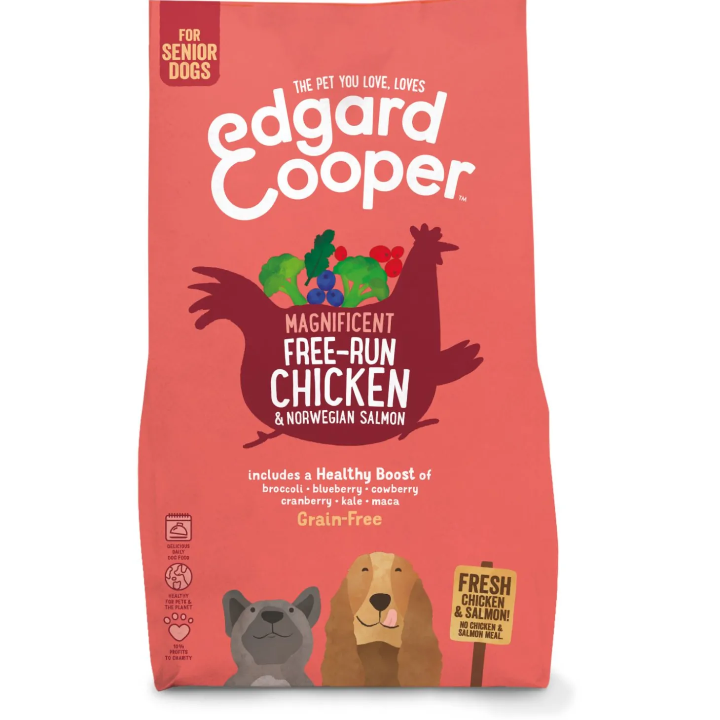 Goed eten is onmisbaar voor een sterk lichaam en een gezonde geest, dit kan je bereiken met een lekkere combinatie van vers vlees, groenten en fruit zoals Magnificent Free-Run Chicken & Norwegian Salmon van Edgard & Cooper voor oude honden.