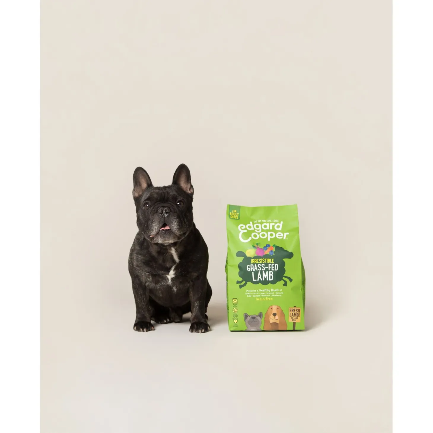 Irresistible Grass-Fed Lamb is verkrijgbaar in een normale brok voor kleine en middelgrote honden (700 g, 2,5 kg en 7 kg) en in een grote brok voor grote honden (12 kg).