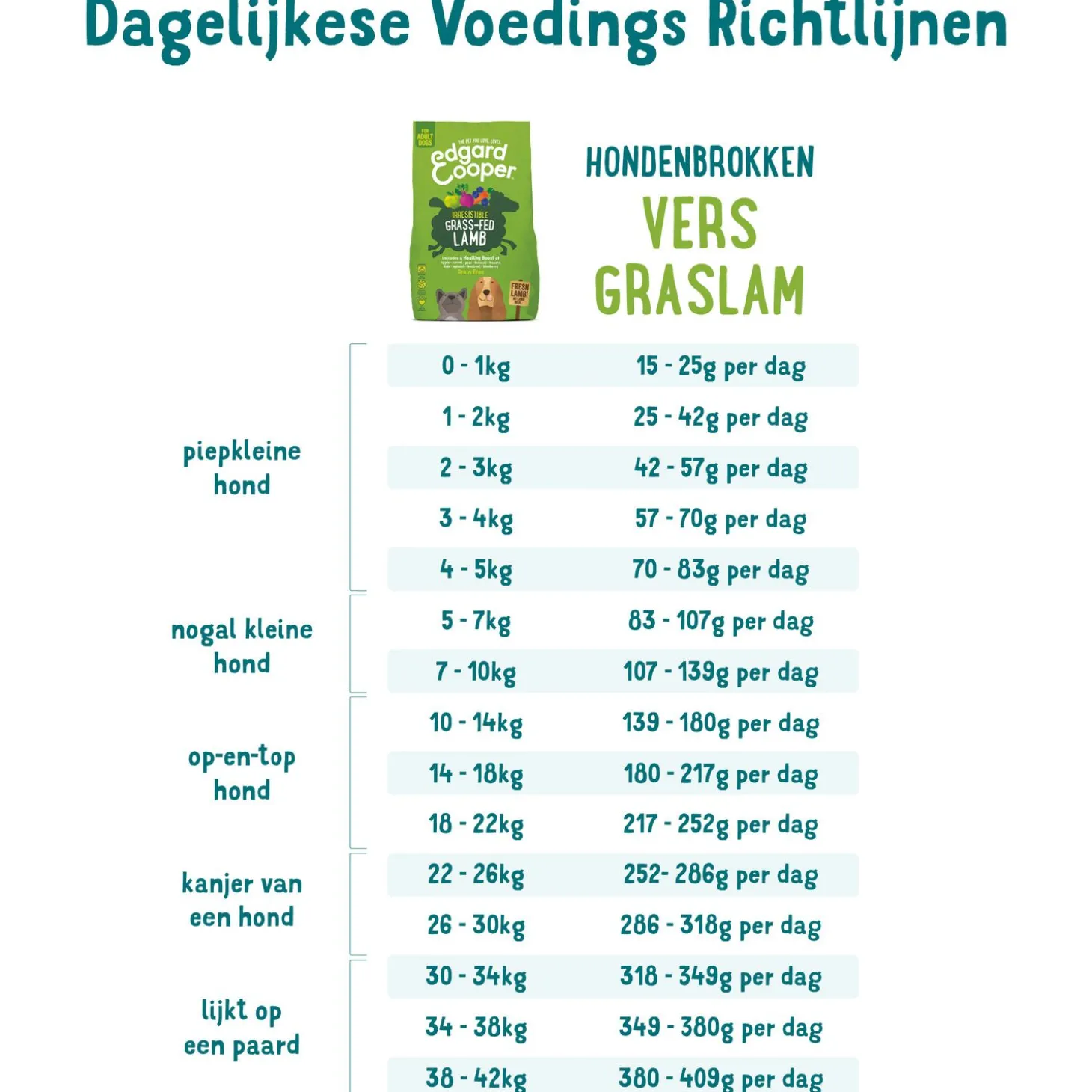 | Samenstelling | Vers lam 41%, aardappelen, erwten, erwteneiwit, lijnzaad, lamssaus, zonnebloemolie, mineralen, aardappeleiwit, visolie, mannan-oligosachariden (MOS), fructo-oligosachariden (FOS), wortels 0,04%, appels 0,04%, peer 0,04%, broccoli 0,04%, banaan 0,04%, boerenkool 0,04%, spinazie 0,04%, rode bieten 0,04%, bosbessen 0,04%, goudsbloemblaadjes, brandnetel, braambesblaadjes, venkel, karwij, kamille, melisse. Nutritionele toevoegingsmiddelen/kg: vitamineA 20.000IE, vitamineD3 2.000IE, vitamineE 350mg. IJzer (ijzer(II)sulfaat-monohydraat) 75mg; jodium (kaliumjodide) 3,5mg; koper (koper(II)sulfaatpentahydraat) 10mg; mangaan (mangaan(II)sulfaat-monohydraat) 7,5mg; zink (zinkoxide) 150mg; selenium (natriumseleniet) 0,15mg. |