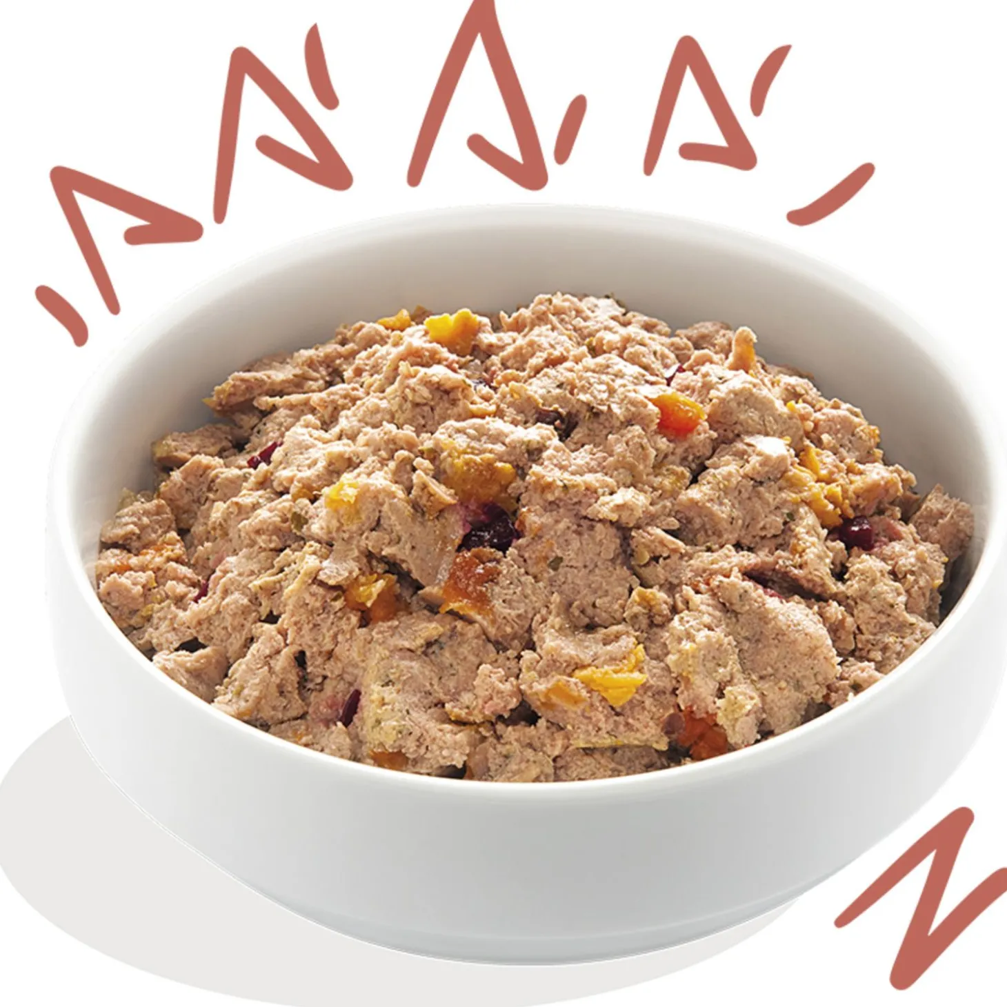 Dit vleeskuipje zit boordevol heerlijke kip en zalm, fantastische bronnen van magere eiwitten en omega 3, en is op een lage temperatuur gegaard. De natvoeding is speciaal ontwikkeld voor oude honden, zo zorgen de eiwitten en omega 3 voor gezonde en sterke hersenen. De voedingswaarde wordt verder opgekrikt met extra voedzame vleesoverschotten, zoals hart en lever. Verder is het kuipje aangevuld met broccoli en veenbes en zorgen lekkere kruiden en botanicals voor een extra boost.