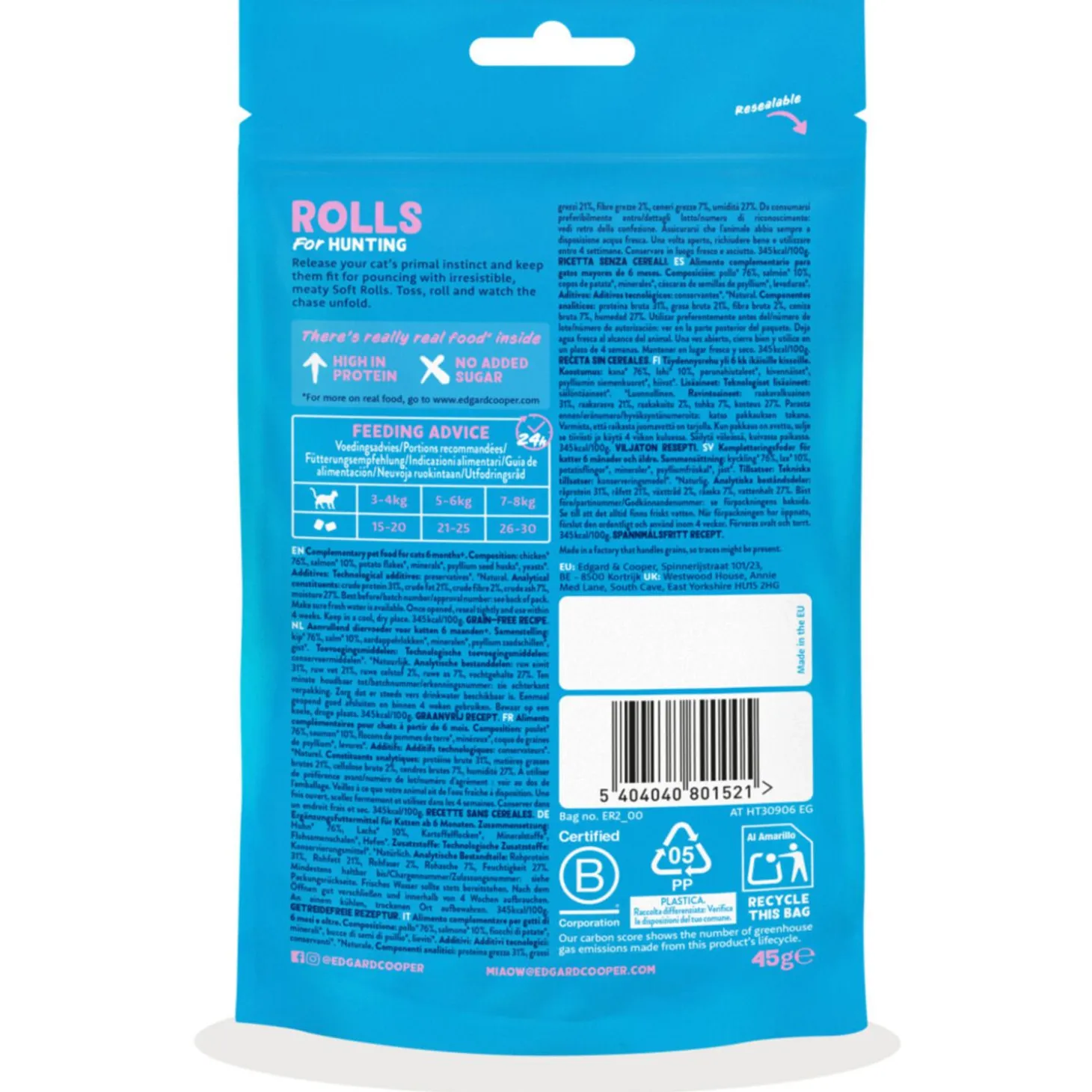| Aanbeveling | Hoe een snack een spannend jachtavontuur wordt met onze onweerstaanbare Soft Rolls boordevol zalm en kip. Rol of gooi, en geef je kat de ideale prooi. Dat je kat zo ook actief en fit blijft, is goed meegenomen.Onze Rolls bevatten liefst 86% zalm en kip. Ze zijn rijk aan eiwitten en leveren energie voor elke achtervolging. Gemaakt met natuurlijke ingrediënten, zonder granen of toegevoegde suiker.Laat de innerlijke tijger in je kat los en bedank het universum dat de jacht op Rolls de jacht op jouw voeten vervangt. Ideaal voor katten vanaf 6 maanden. |