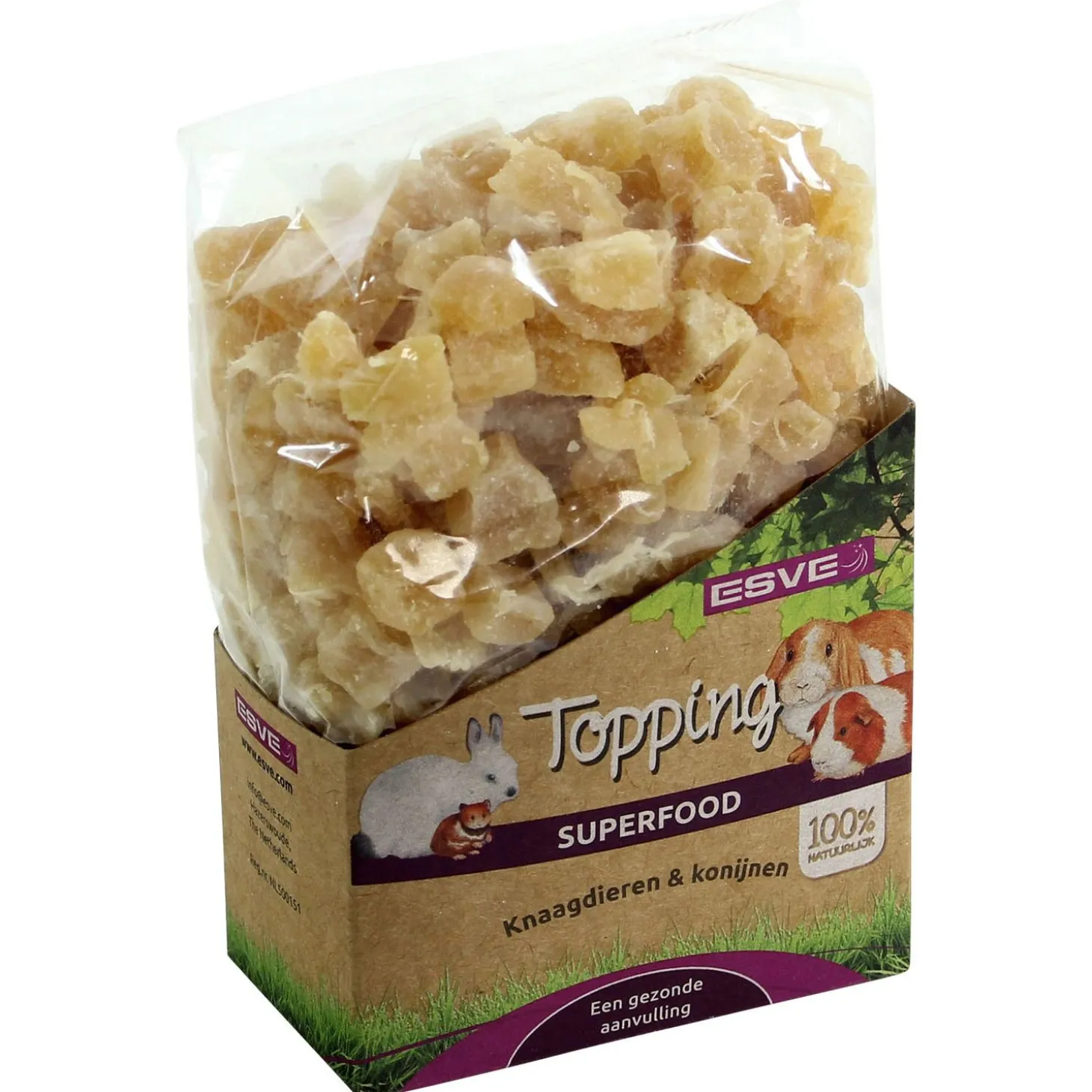 Af en toe wil je je konijn of knaagdier eens verwennen met een lekkere traktatie. De Topping Ananas van ESVE is een aanvullende, natuurlijke lekkernij met gedroogde ananas. Ananas is erg gezond en bevat onder andere vitamine C, zink, foliumzuur, bètacaroteen, kalium en mangaan.