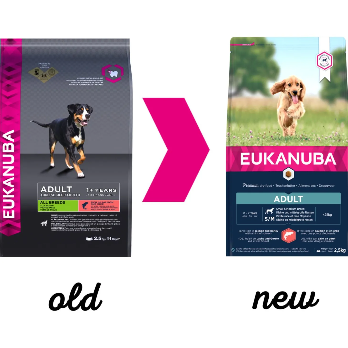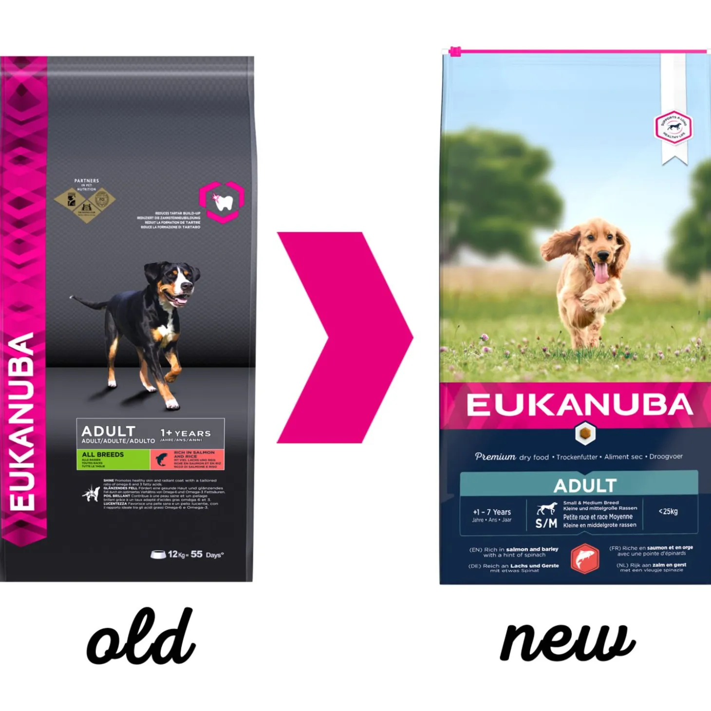 | Samenstelling | Samenstelling: gedroogde kip en kalkoen (een natuurlijke bron vanglucosamine en chondroïtinesulfaat), zalm (14%), gerst (14%), maïs, havervlokken, sorghum, vismeel, varkensvet, gedroogde bietenpulp (2.6%), zonnebloemolie,kippenjus, mineralen (waaronder natriumhexametafosfaat 0.35%), fructo-oligosachariden (0.25%), gedroogde spinazie (0.1%), gedroogde biergist. |