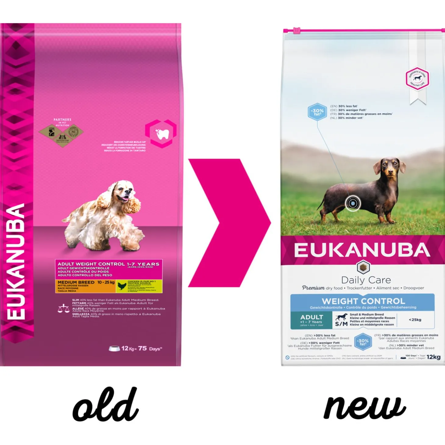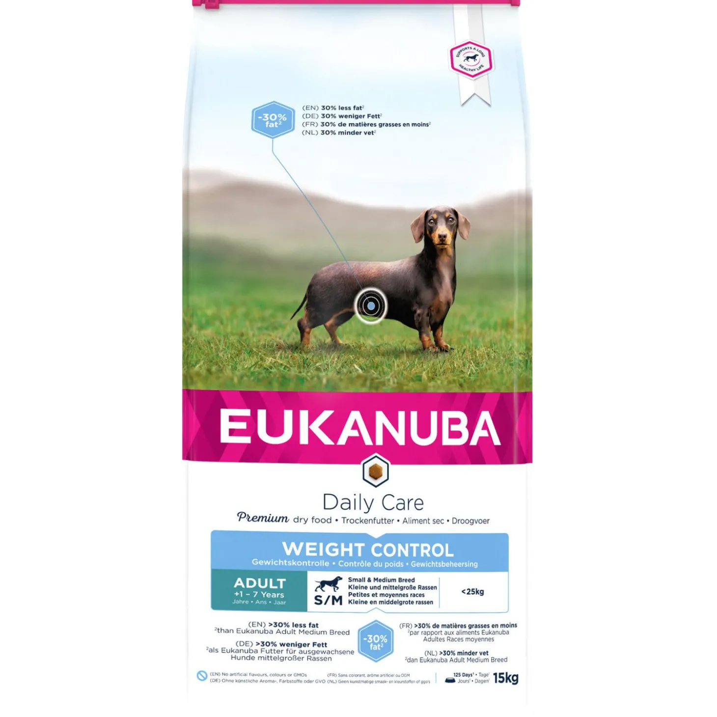 Een 100% gebalanceerd recept voor jouw kleine of middelgrote volwassen hond voor een gezond gewicht, dat is Eukanuba Daily Care Weight Control van Eukanuba. Deze brok is geschikt voor honden van kleine rassen (tot 10 kg) óf voor honden van middelgrote rassen (van 10 tot 25 kg) van 1 tot 7 jaar oud.