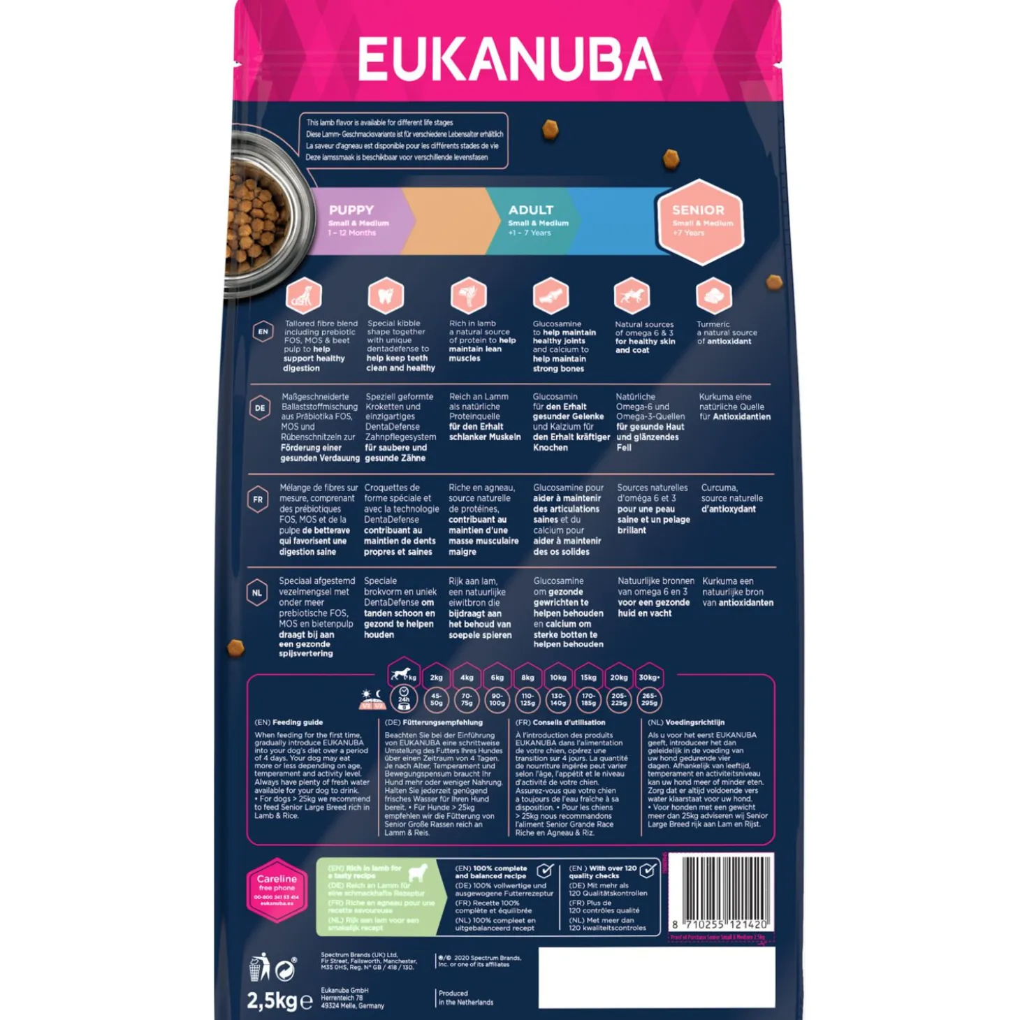 Eukanuba Mature & Senior Lam & Rijst is verkrijgbaar in 2,5 kg en 12 kg.
