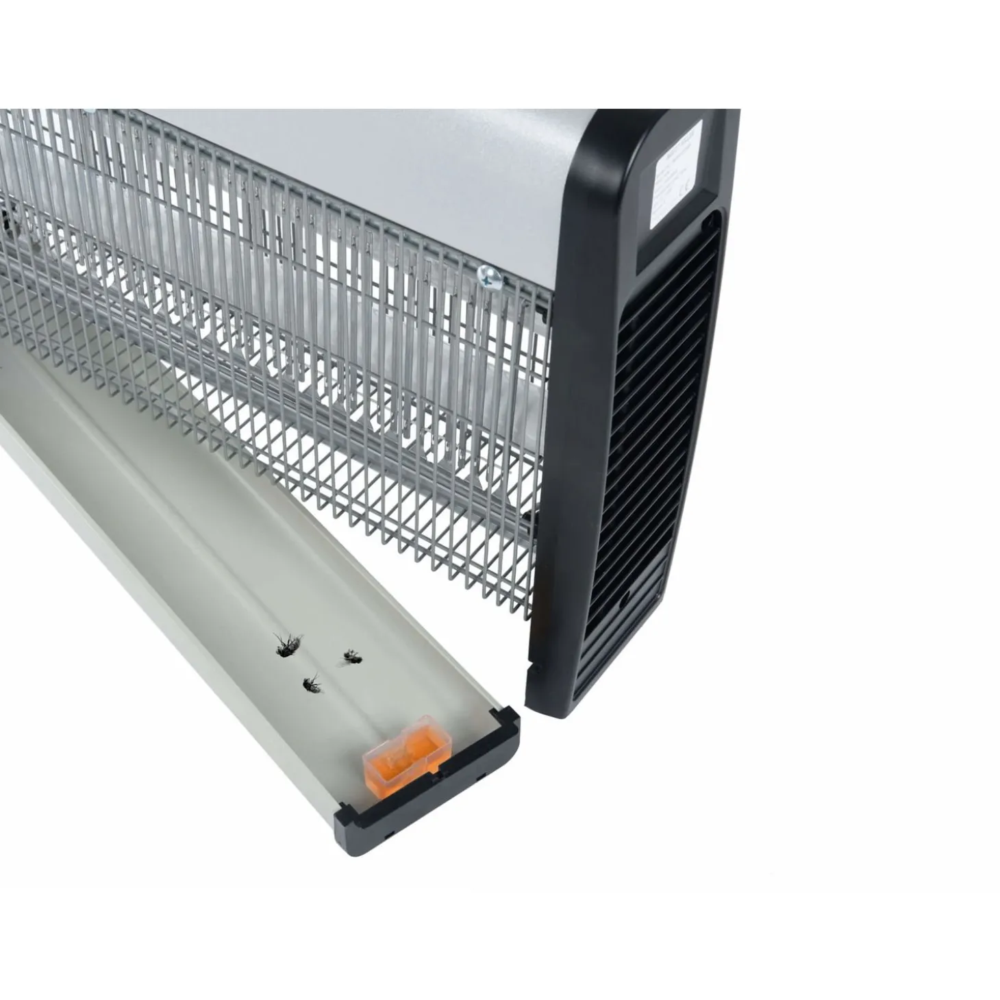 Dit apparaat is een krachtige elektrische insectendoder voor binnenshuis, zoals in je eigen huis, maar ook voor op kantoor of in een winkel. Het werkt op twee UV-lampen van 18 watt waarmee een gebied van 200 m2 insectvrij kan worden gemaakt. De insecten worden aangetrokken door de combinatie van het licht van de vliegenlamp en door een speciaal lokstofreservoir, hierna worden ze door het hoogspanningsrooster van 2500 volt geëlektrocuteerd. De dode vliegen worden verzameld in een praktisch opvangbakje dat makkelijk schoon te maken is. Het product werkt tegen meerdere vliegende insecten zoals vliegen, motten en muggen.
