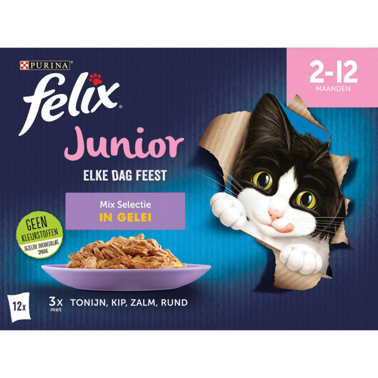 Wat is er nou lekkerder dan de natvoersensaties van Felix? De Felix Elke Dag Feest Junior Mix Selectie in Gelei bevat 12 maaltijdzakjes die gevuld zijn met smakelijke vleesreepjes in combinatie met een onweerstaanbare gelei. Speciaal voor kittens van 2 tot 12 maanden oud.
