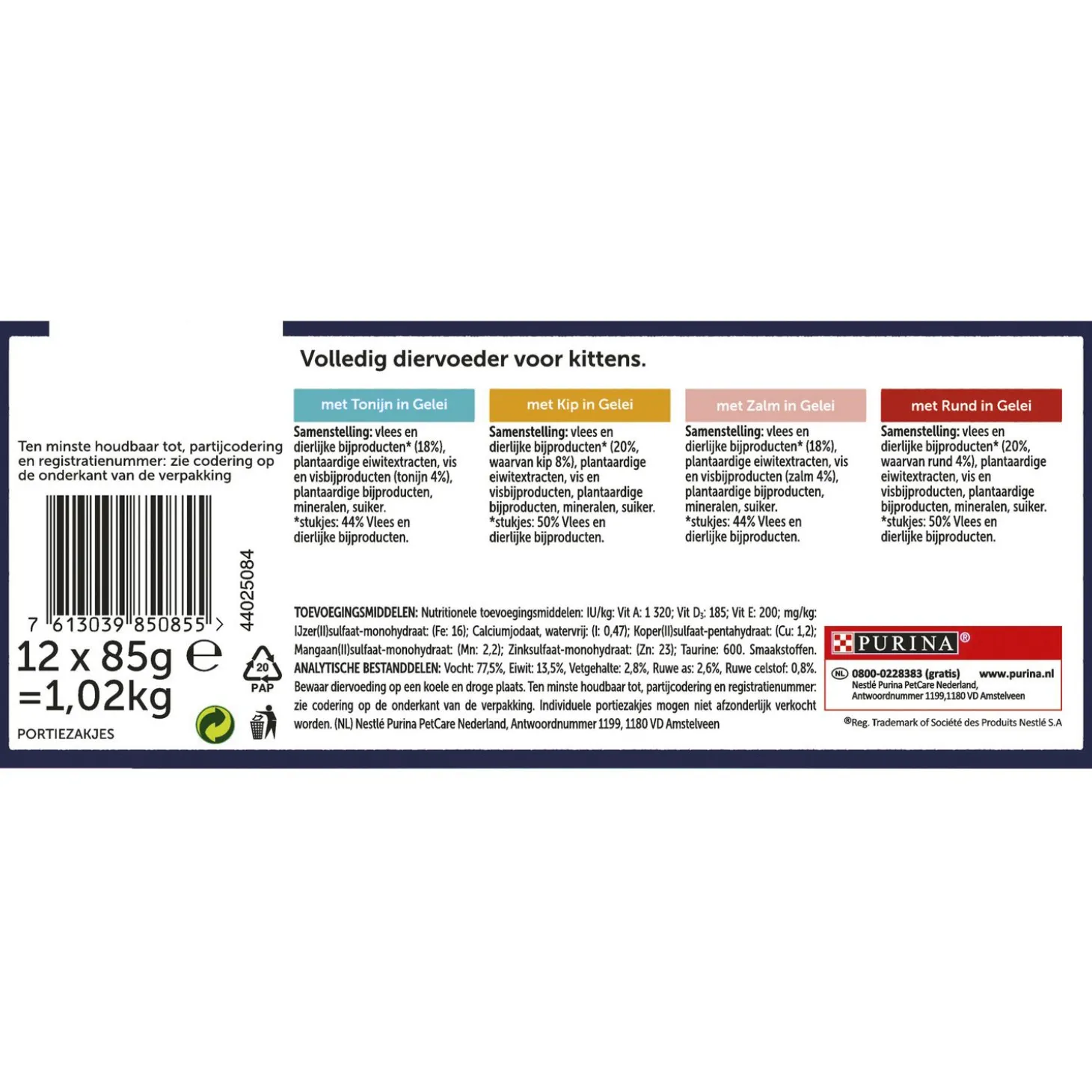 | Samenstelling | Met Tonijn Samenstelling: Vlees en Dierlijke Bijproducten* (18%), Plantaardige Eiwitextracten, Vis en Visbijproducten (Tonijn 4%), Plantaardige Bijproducten, Mineralen, Suiker. *Stukjes: 44% Vlees en Dierlijke Bijproducten. Met Kip Samenstelling: Vlees en Dierlijke Bijproducten* (20%, waarvan Kip 8%), Plantaardige Eiwitextracten, Vis en Visbijproducten, Plantaardige Bijproducten, Mineralen, Suiker. *Stukjes: 50% Vlees en Dierlijke Bijproducten. Met Zalm Samenstelling: Vlees En Dierlijke Bijproducten* (18%), Plantaardige Eiwitextracten, Vis en Visbijproducten (Zalm 4%), Plantaardige Bijproducten, Mineralen, Suiker. *Stukjes: 44% Vlees en Dierlijke Bijproducten. Met Rund Samenstelling: Vlees en Dierlijke Bijproducten* (20%, waarvan Rund 4%), Plantaardige Eiwitextracten, Vis en Visbijproducten, Plantaardige Bijproducten, Mineralen, Suiker. *Stukjes: 50% Vlees en Dierlijke Bijproducten. |