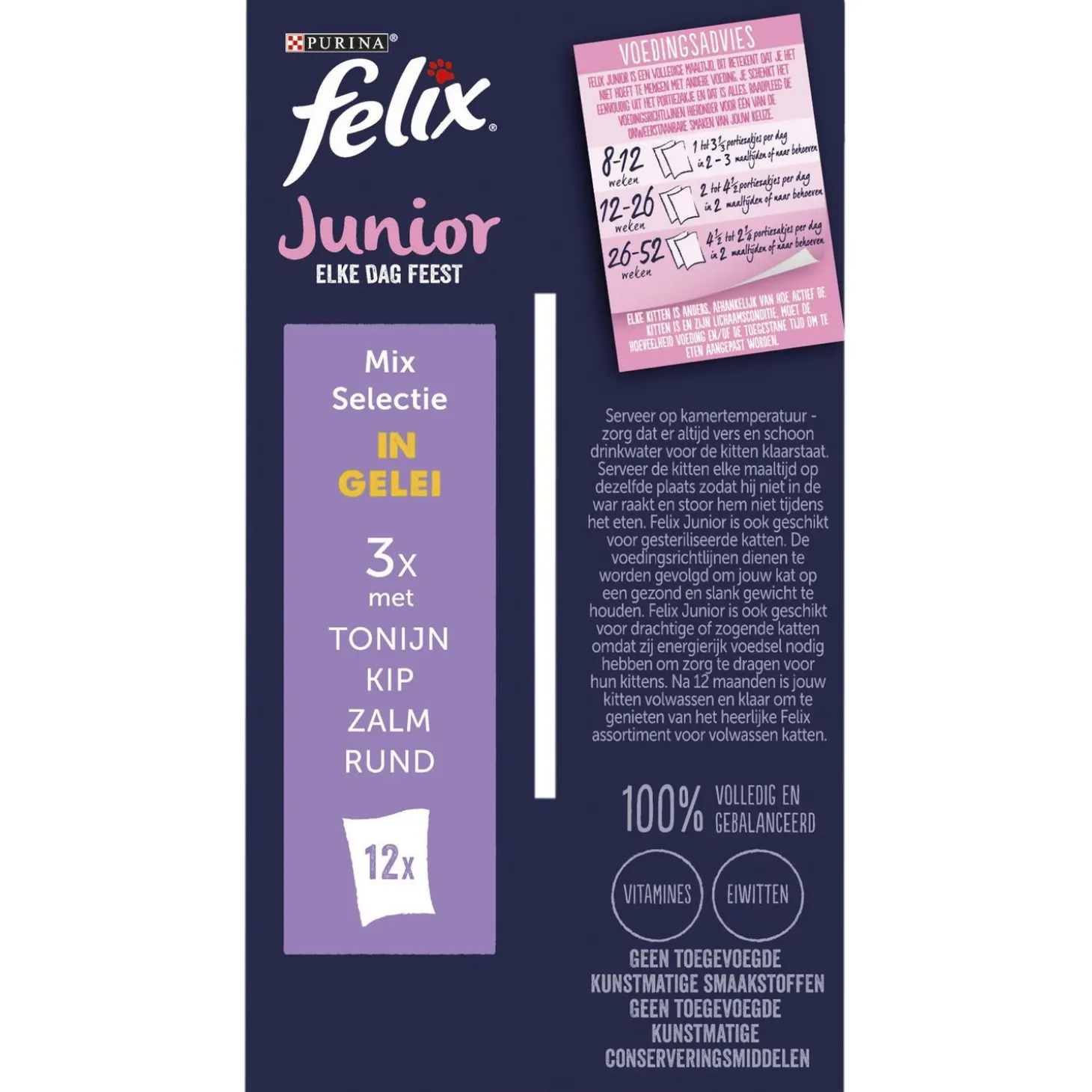 | Aanbeveling | Voedingsadvies: Felix Junior is een volledige maaltijd, dit betekent dat je het niet hoeft te mengen met andere voeding. Je schenkt het eenvoudig uit het portiezakje en dat is alles. Raadpleeg de voedingsrichtlijnen op de verpakking voor één van de onweerstaanbare smaken van jouw keuze. Elke kitten is anders, afhankelijk van hoe actief de kitten is en zijn lichaamsconditie, moet de hoeveelheid voeding en/of de toegestane tijd om te eten aangepast worden. Serveer op kamertemperatuur – zorg dat er altijd vers en schoon drinkwater voor de kitten klaarstaat. Serveer de kitten elke maaltijd op dezelfde plaats zodat hij niet in de war raakt en stoor hem niet tijdens het eten. Felix Junior is ook geschikt voor gesteriliseerde katten. De voedingsrichtlijnen dienen te worden gevolgd om jouw kat op een gezond en slank gewicht te houden. Felix Junior is ook geschikt voor drachtige of zogende katten omdat zij energierijk voedsel nodig hebben om zorg te dragen voor hun kittens. Na 12 maanden is jouw kitten volwassen en klaar om te genieten van het heerlijke Felix assortiment voor volwassen katten. |