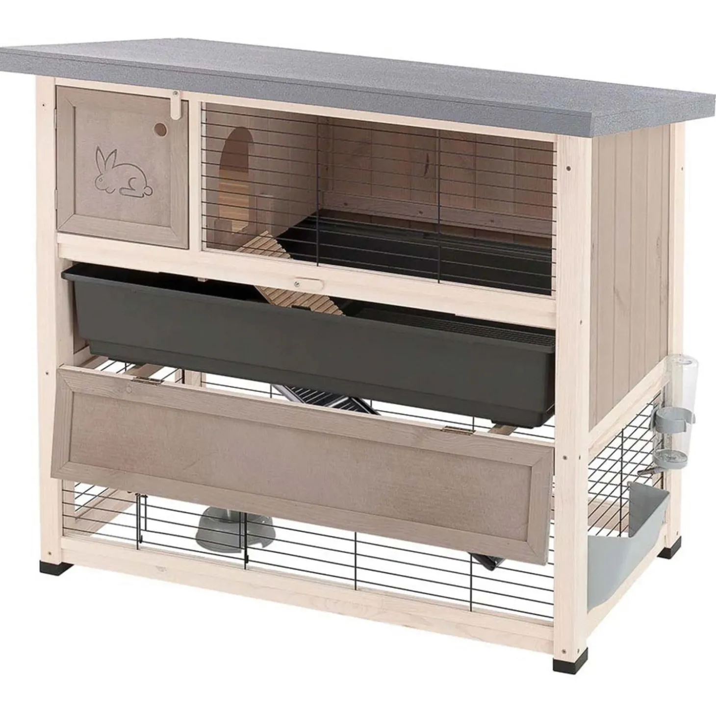 Het nachthok is gemaakt van hout en heeft een handig te openen zijdeur zodat je makkelijk bij het verblijf kan komen en het beschikt over een efficiënt en veilig sluitsysteem. De onderste helft van het hok dient als een ren waarin je konijnen vrij kunnen spelen, eten en drinken. Via het schuifdeurtje kunnen je konijnen uit het verblijf en kunnen ze vrij rondlopen in je tuin of huis.