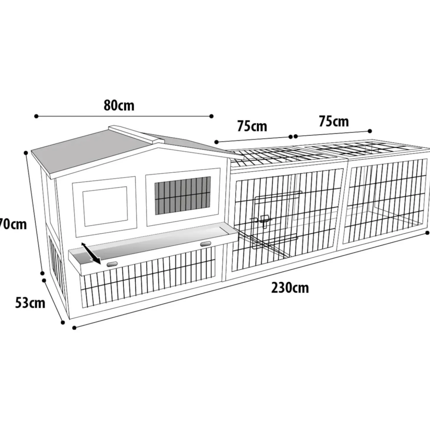 Het Konijnenhok met ren Sunshine Jumbo is 230 x 53 x 70 cm.