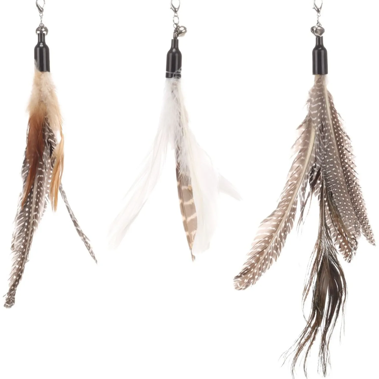 Deze handige clip-on speeltjes geven je kattenhengel een tweede leven! De mix van natuurlijke veren in verschillende texturen en patronen gecombineerd met een rinkelend kattenbelletje zorgen voor nieuwe uitdagingen en blijven je kat urenlang boeien. Door regelmatig te wisselen van speeltje houdt je kat interesse in het spel.