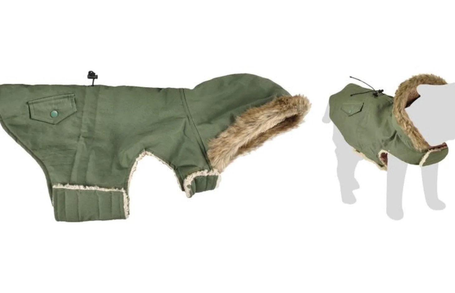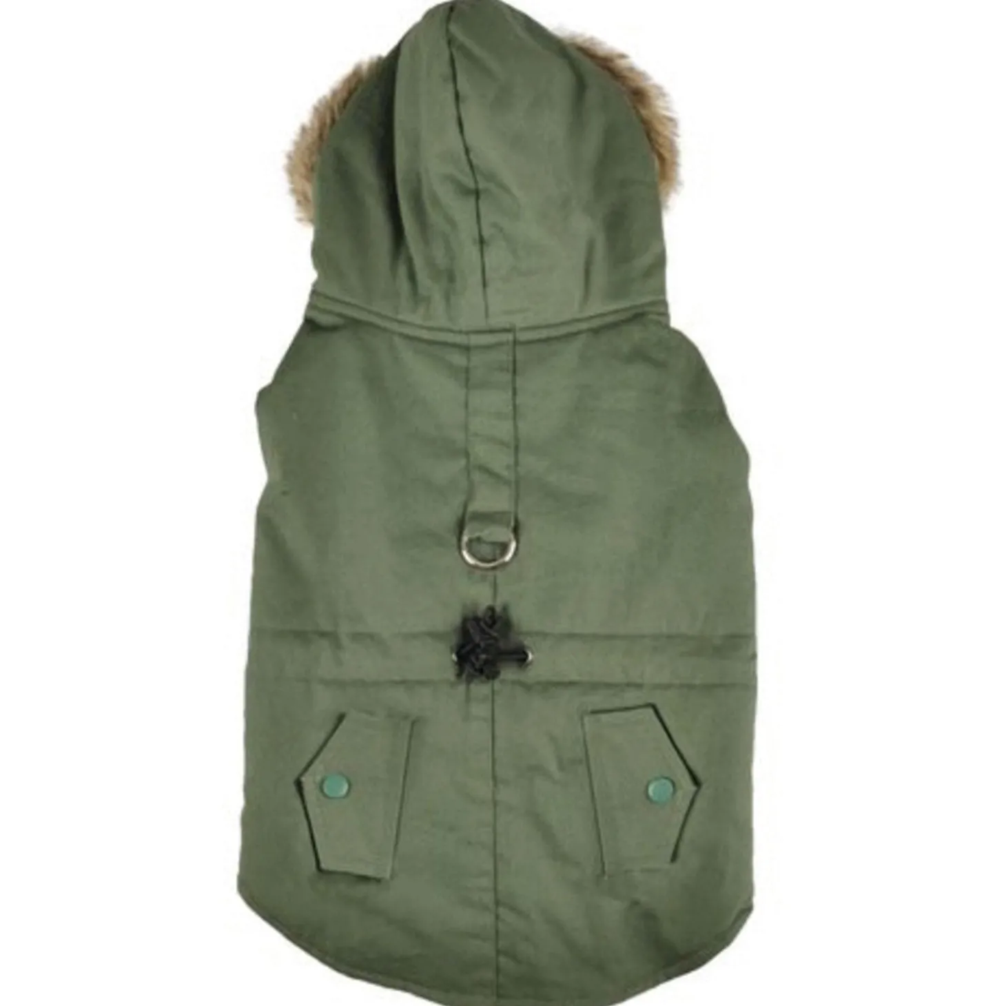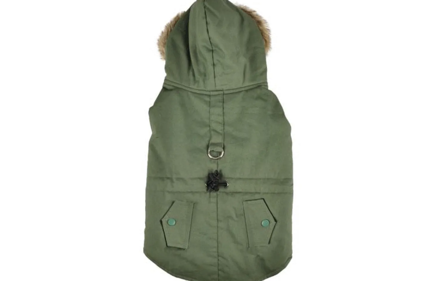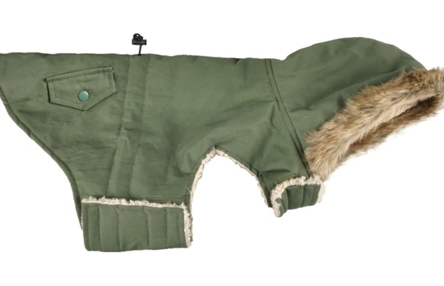 Ook heeft de jas een capuchon met daaraan een kraag van nepbont. Je maakt de jas eenvoudig vast met klittenband bij de buik en nek. Bij de nek zit een kleine opening waar je de riem doorheen kunt doen. Met een buikstrop kan je het jasje nog beter aanspannen. De jas kan op 30 graden gewassen worden.