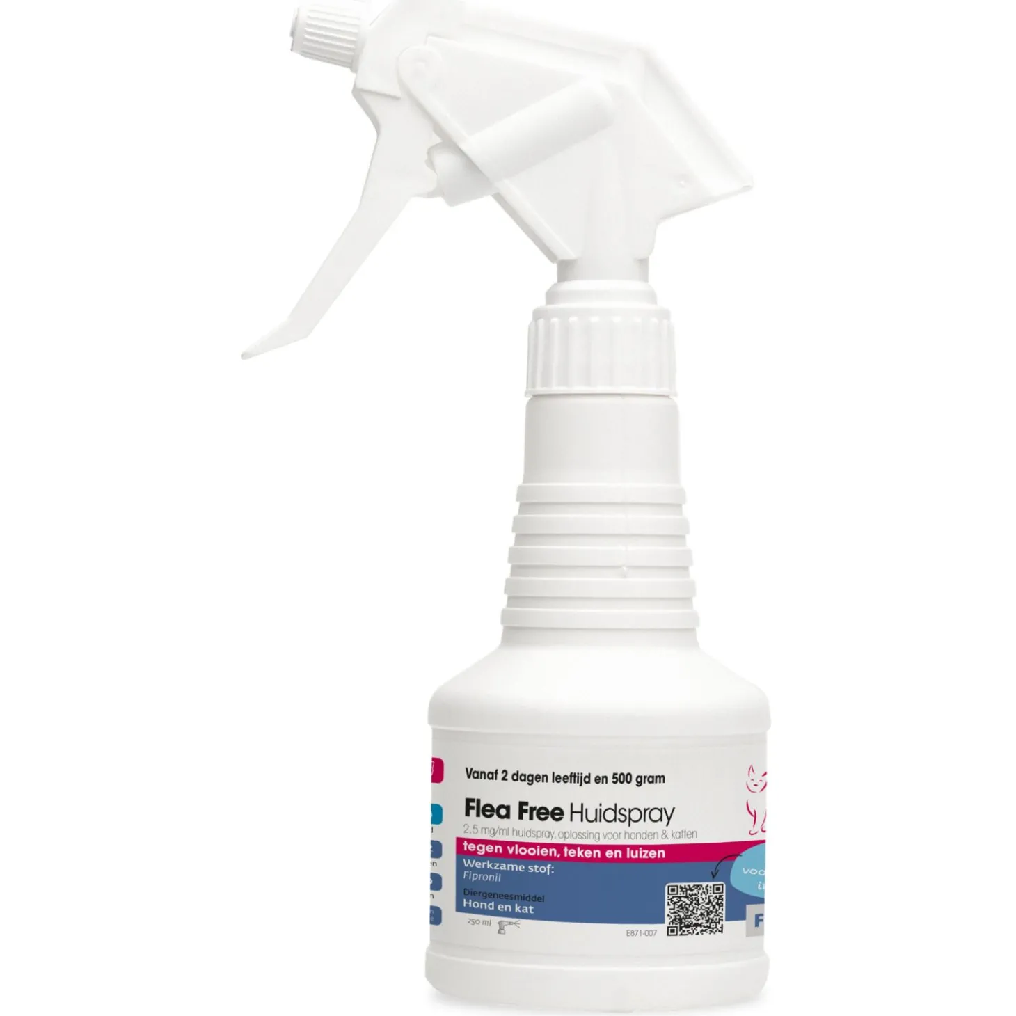 Vlooien, luizen en teken zijn irritante beestjes, ze jeuken en kriebelen en kunnen ook nog vervelende ziektes met zich mee dragen. Als je hond of kat er last van heeft, wil je ze dan ook zo snel mogelijk bestrijden. De Flea Free Huidspray helpt hierbij! Het is een teken- en vlooienspray met de werkzame stof Fipronil. Dit product heeft dezelfde werking als de Frontline spray. Na toediening van deze spray op de huid van jouw hond of kat is hij beschermt tegen vlooien (3 maanden bij honden en 6 weken bij katten) en teken (tot 4 weken). Daarnaast behandelt de huidspray ook infestaties met bijtende luizen.