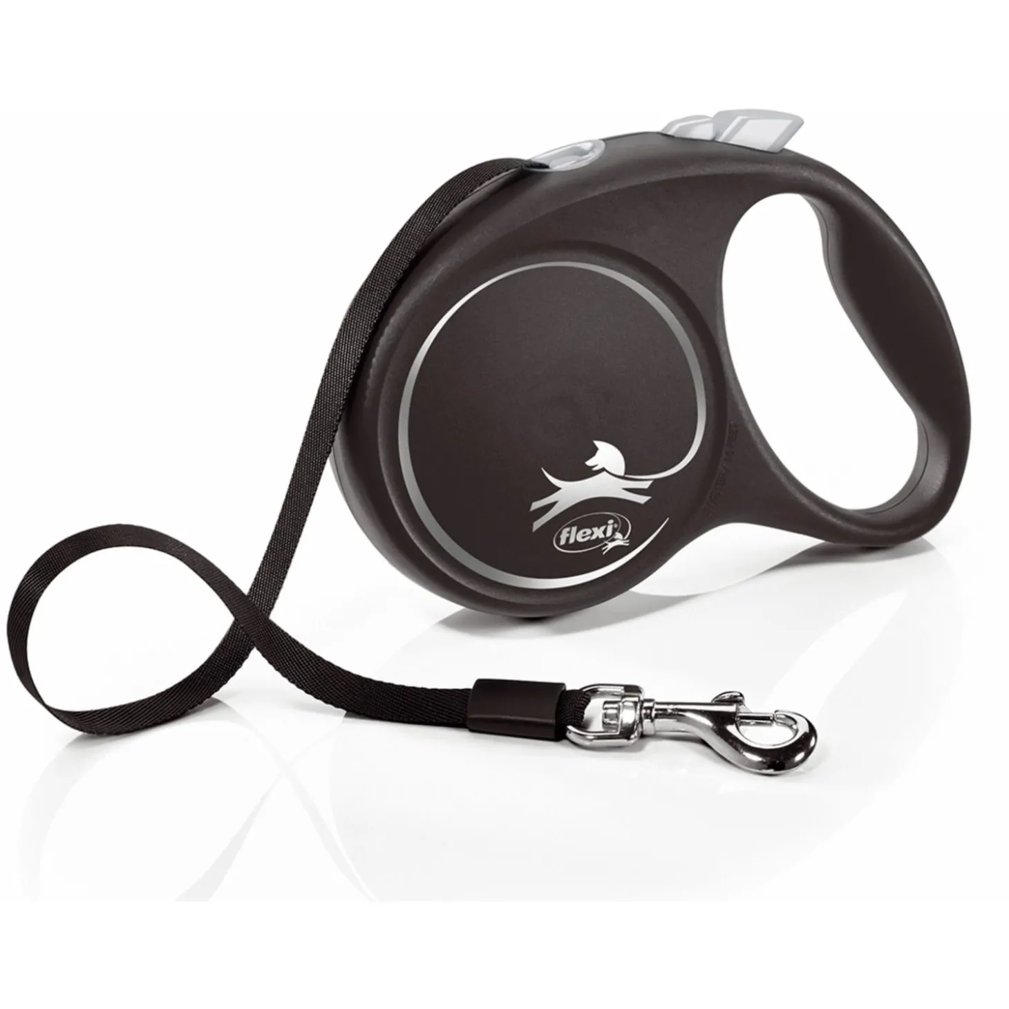 Bij Flexi kan je kiezen tussen lijnen met een koord en lijnen met tape. Het is een persoonlijke voorkeur welke variant je het fijnst vindt. In principe zijn beide soorten even sterk en veilig om te gebruiken. De Black Design Tape bevat een tape.