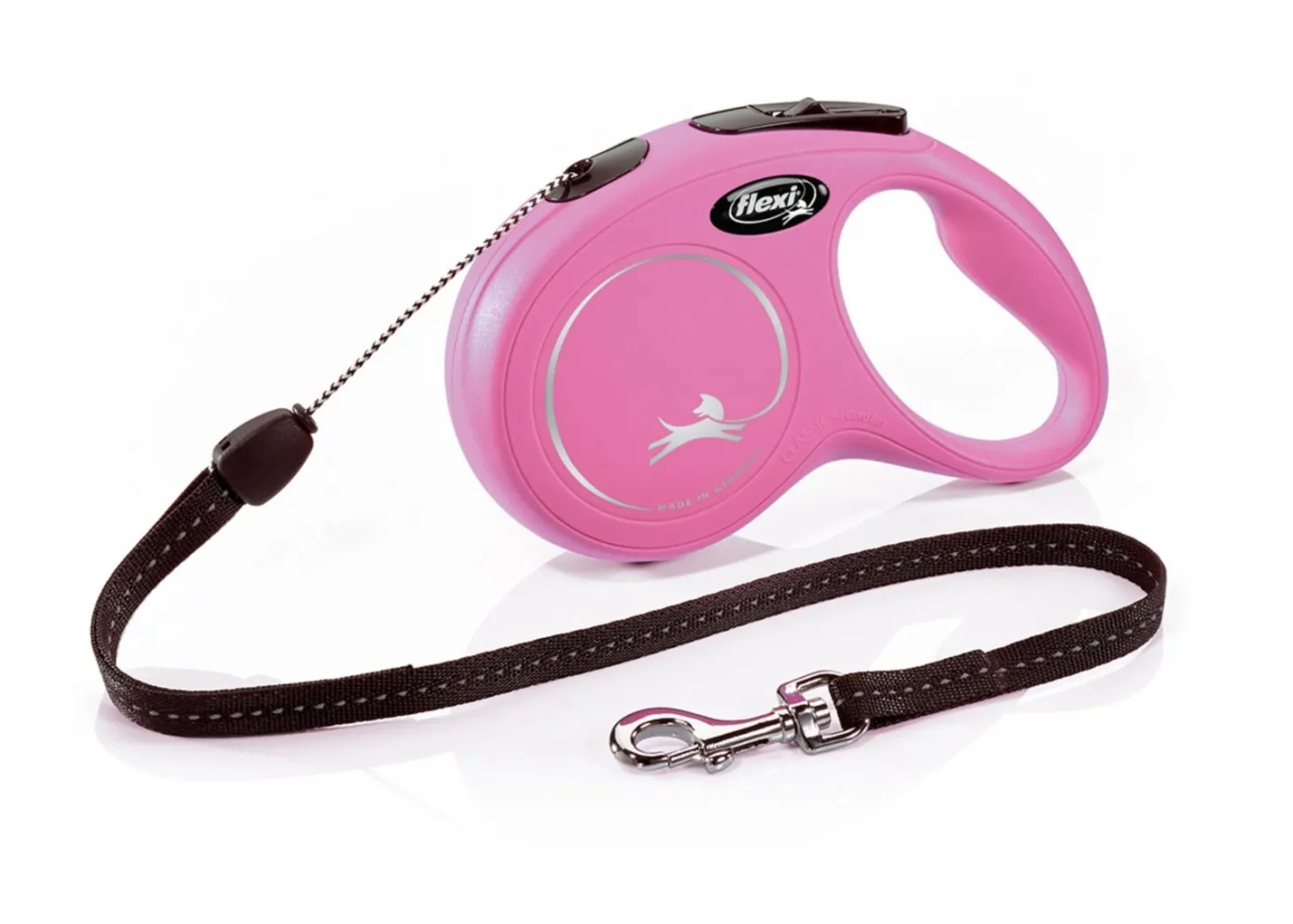 Bij Flexi kan je kiezen tussen lijnen met een koord en lijnen met tape. Het is een persoonlijke voorkeur welke variant je het fijnst vindt. In principe zijn beide soorten even sterk en veilig om te gebruiken. De New Classic Cord bevat een koord.