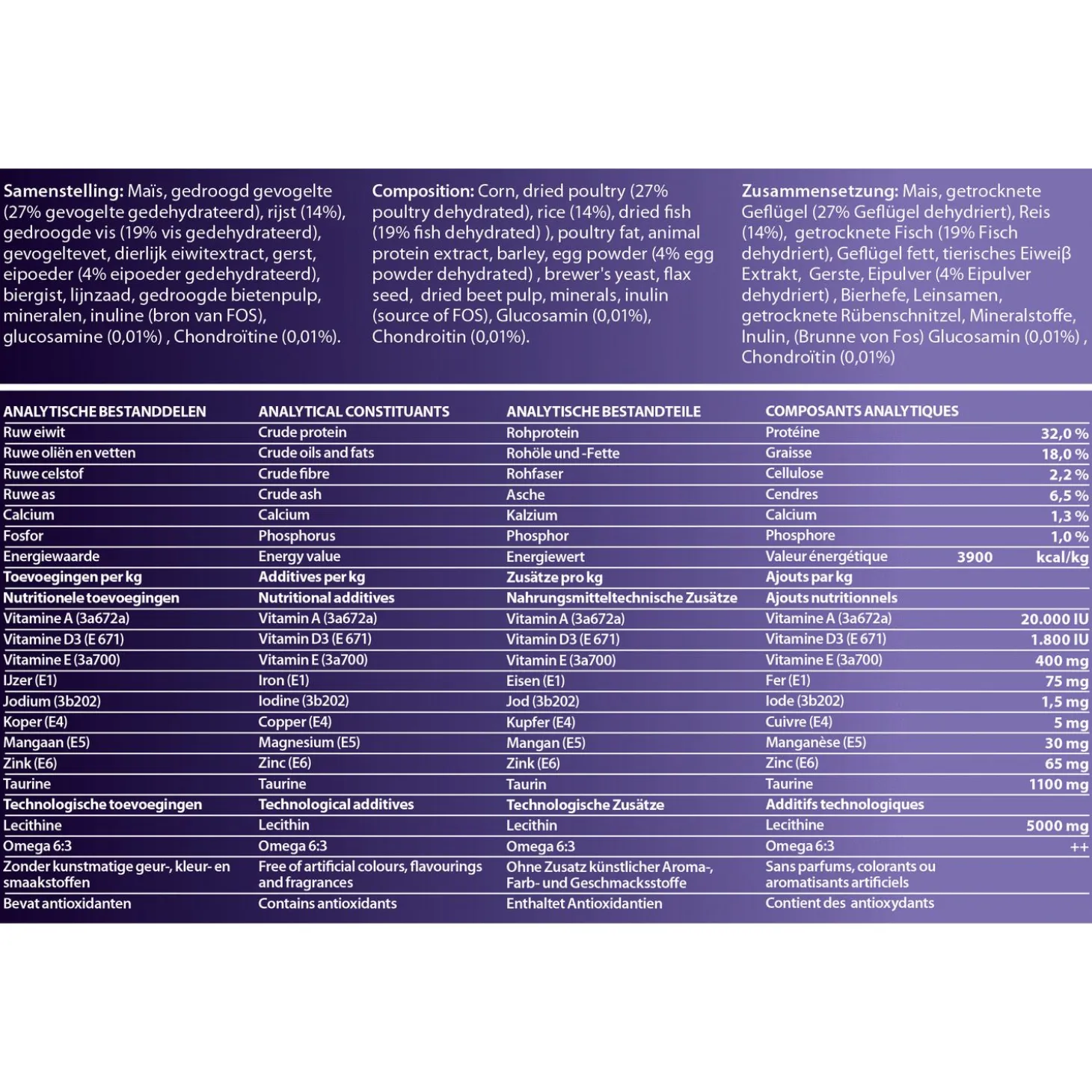 | Samenstelling | Maïs, gedroogd gevogelte (27% gevogelte gedehydrateerd), rijst (14%), gedroogde vis (19% vis gedehydrateerd), gevogelltevet, dierlijk eiwitextract, gerst, eipoeder (4% eipoeder gedehydrateerd), biergist, lijnzaad, gedroogde bietenpulp, mineralen, inuline (bron van FOS), glucosamine (0,01%) , chondroïtine (0,01%). |