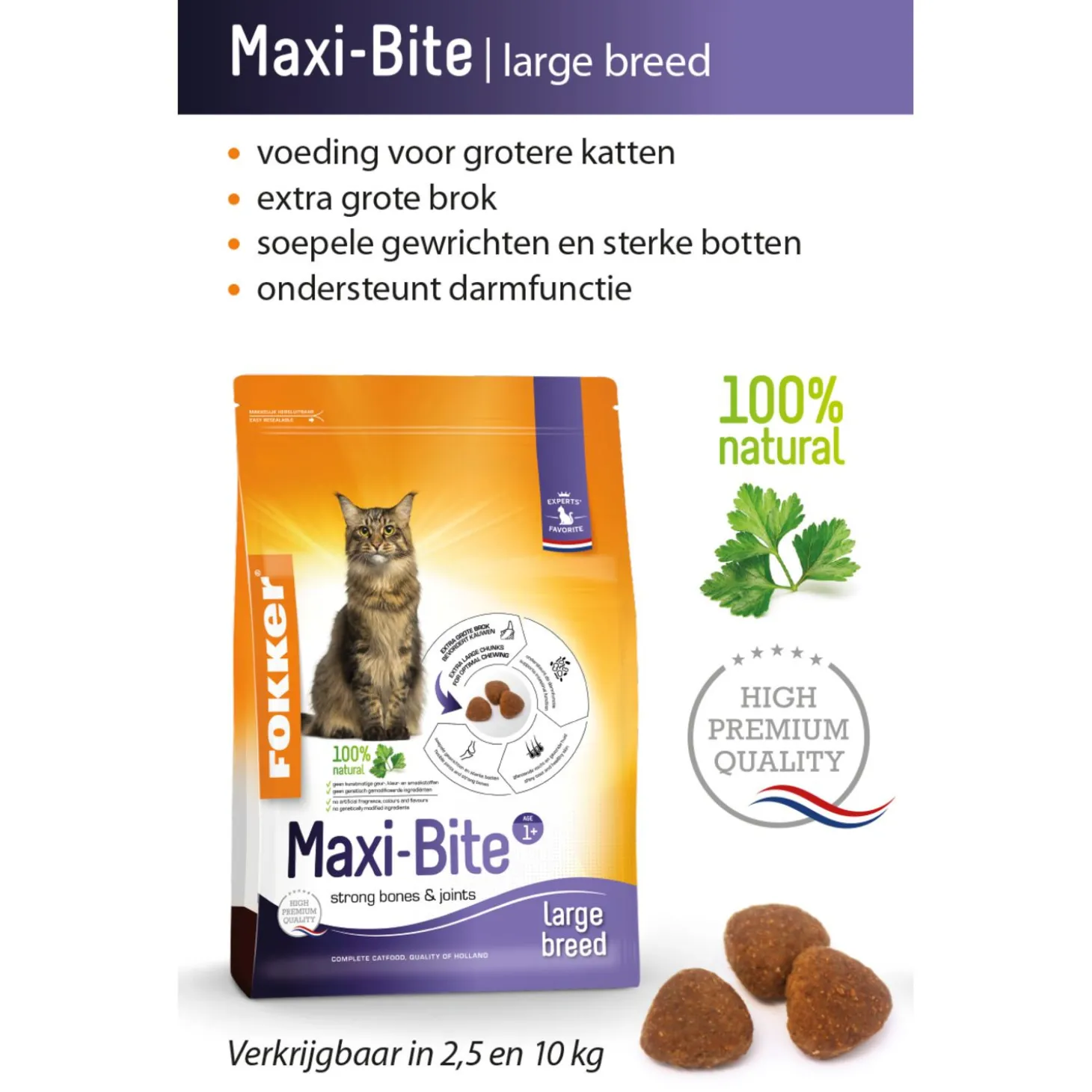 Om jouw kat lichamelijk en mentaal gezond te houden, is het belangrijk dat ze de juiste brokken eet die alle voedingsstoffen bevatten die ze nodig heeft. Katten van grote rassen hebben een andere voedingsbehoefte dan een ‘kleinere’ kat, hun voeding moet hierop zijn aangepast. Maxi-Bite van Fokker is een high premium brokvoeding geschikt voor grotere, volwassen katten.