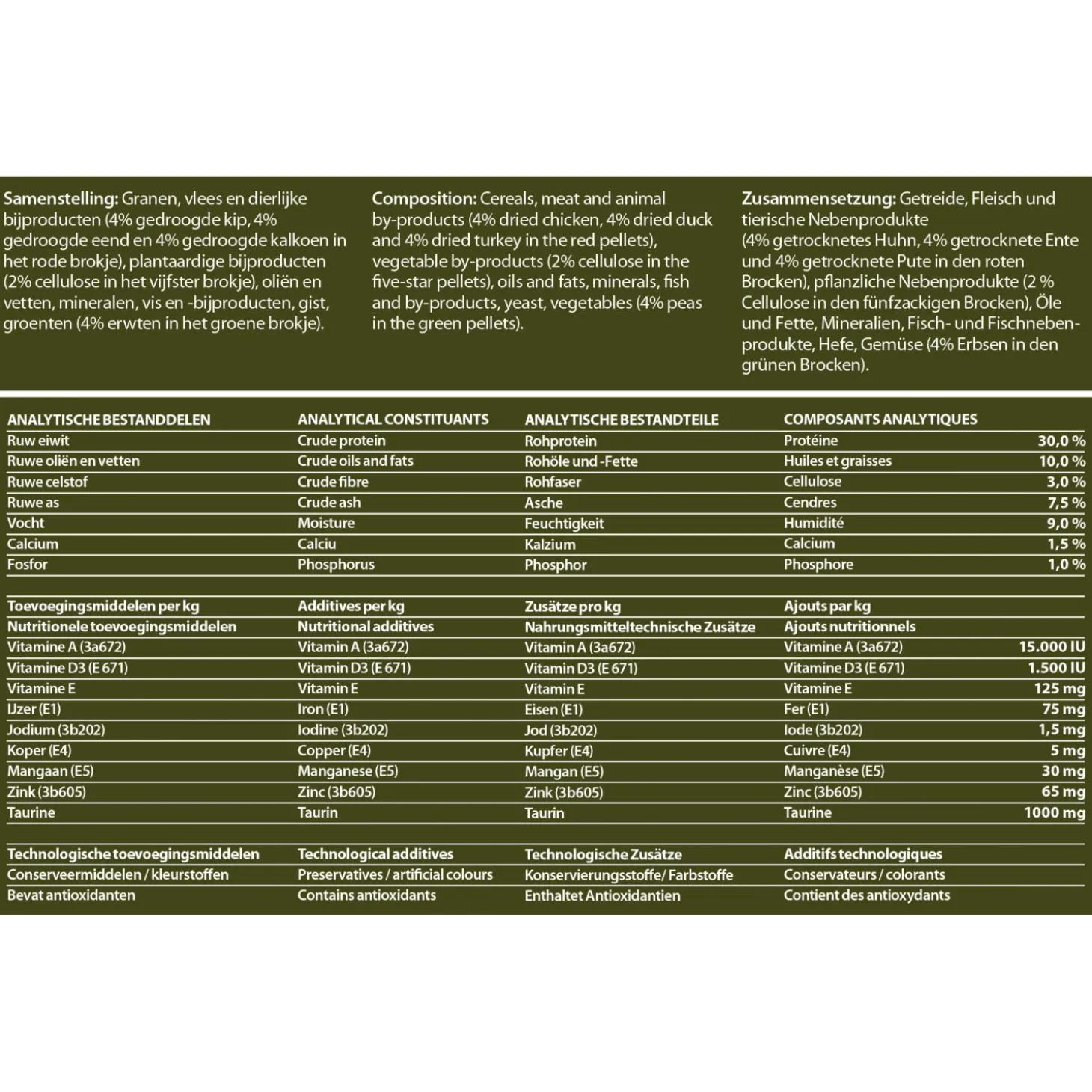 | Samenstelling | Granen, vlees en dierlijke bijproducten (4% kip, 4% eend-wild in de rode brokjes en 4% kalkoen in neusje naturel brokjes), plantaardige bijproducten (2% cellulose in de 5 ster brokjes), Oliën en vetten, mineralen, vis en visbijproducten, gist en groenten (4% groenten in de groene brokjes). |