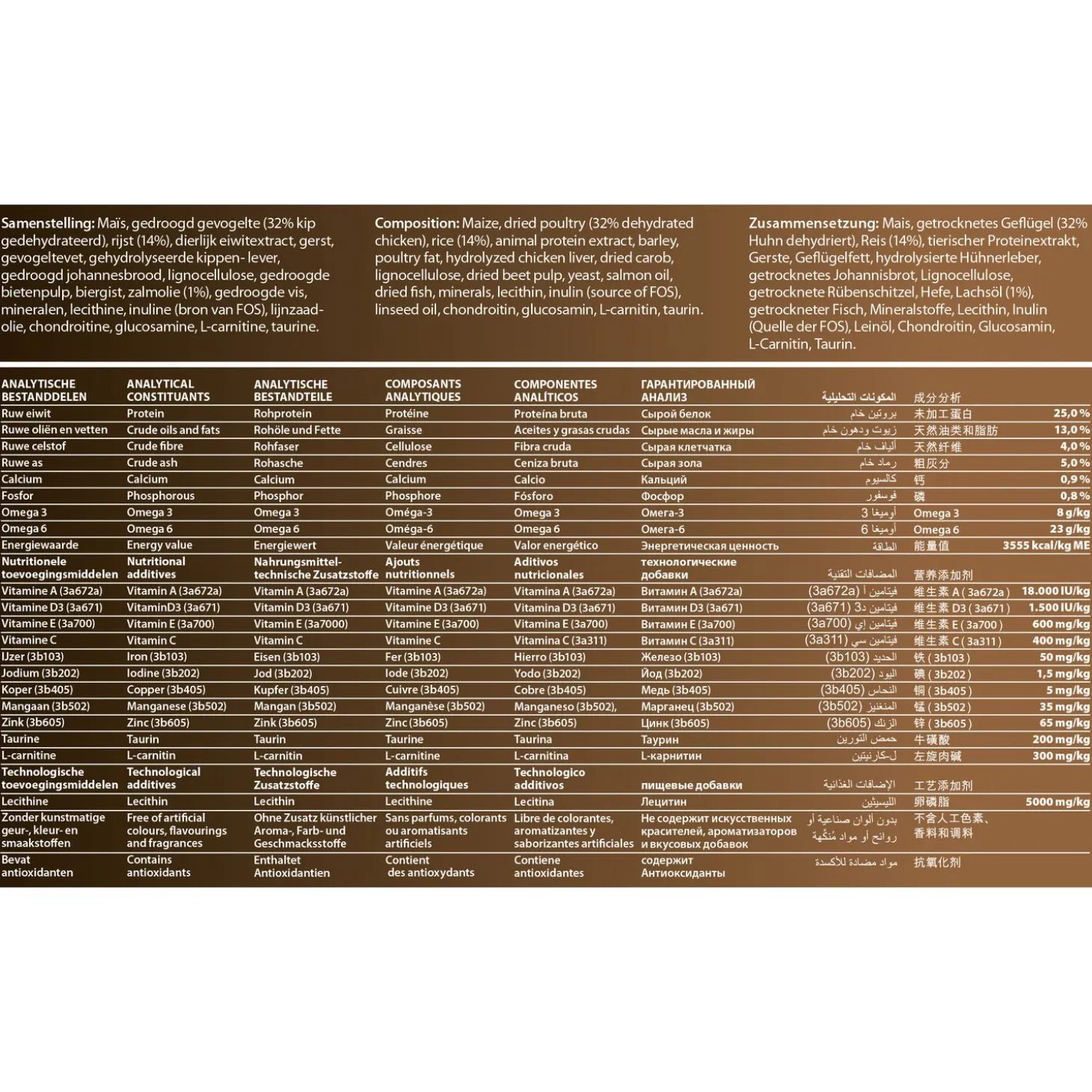 | Samenstelling | Maïs, gedroogd gevogelte (32% kip gedehydrateerd), rijst (14%), dierlijk eiwitextract, gerst, gevogeltevet, gehydrolyseerde kippen- lever, gedroogd johannesbrood, lignocellulose, gedroogde bietenpulp, biergist, zalmolie (1%), gedroogde vis, mineralen, lecithine, inuline (bron van FOS), lijnzaadolie, chondroitine, glucosamine, L-carnitine, taurine. |