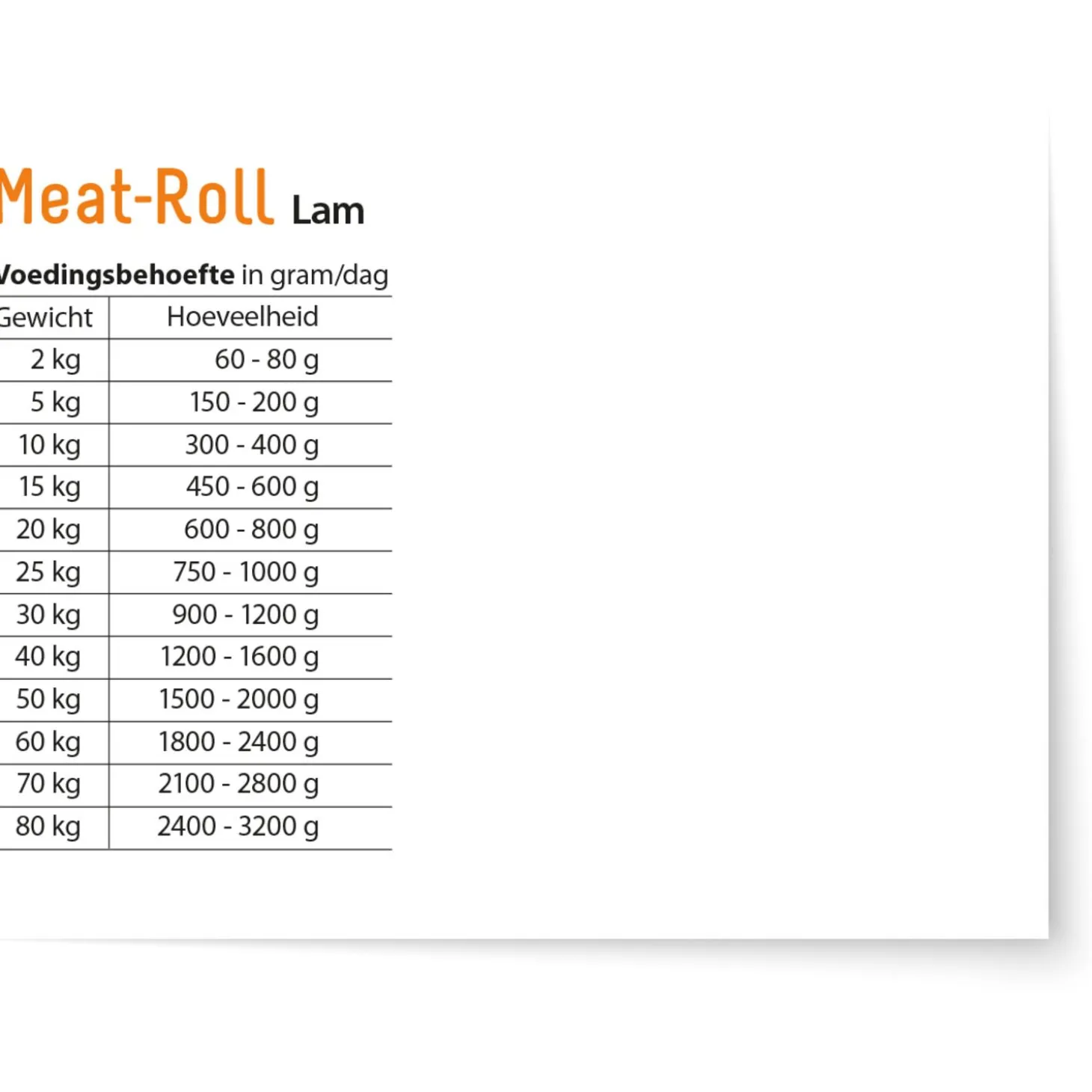 | Aanbeveling | Serveren op kamertemperatuur. Hoeveelheid voeding: 30-40 gr. per kg. lichaamsgewicht |