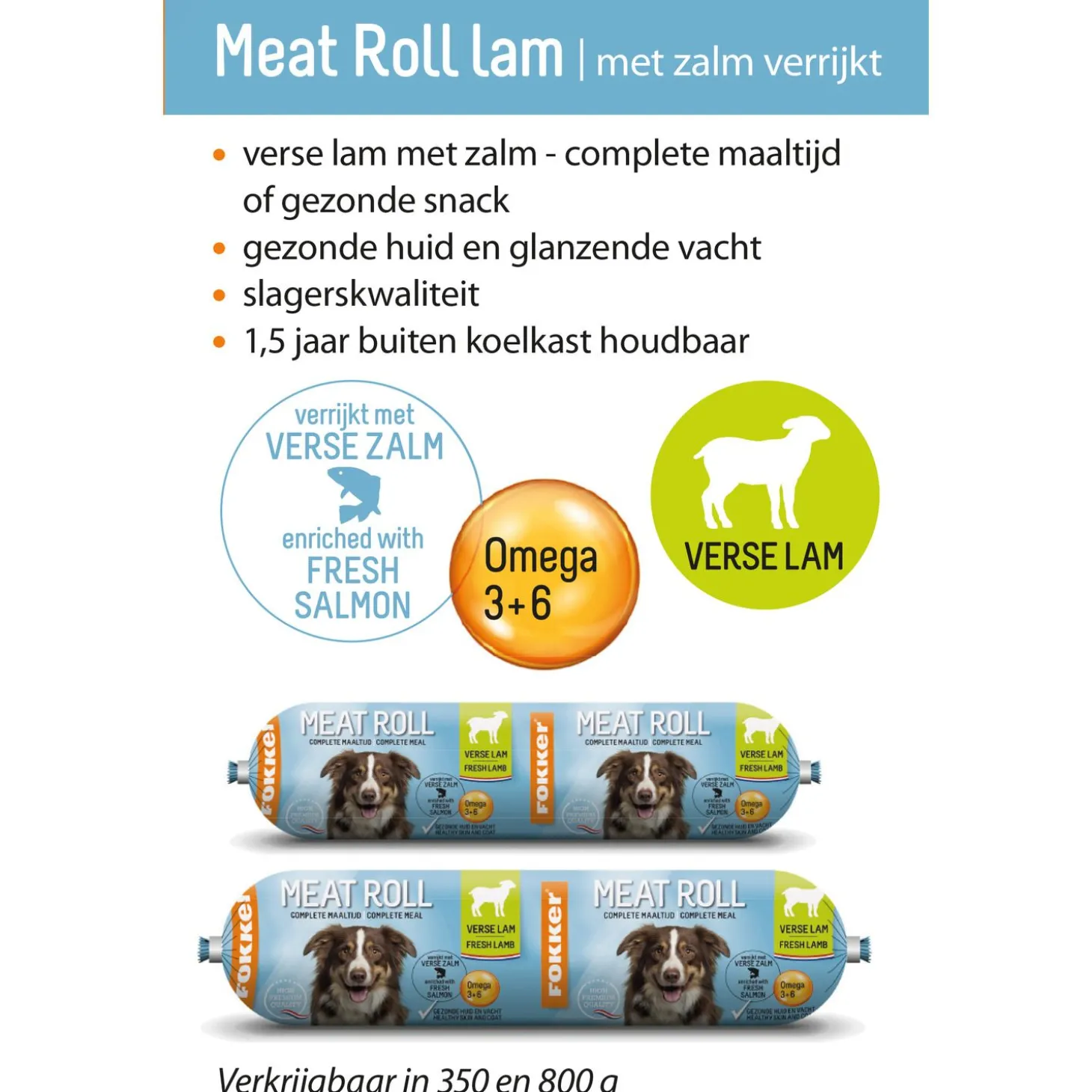 Meat Roll bevat omega 3- en 6-vetzuren voor een gezonde en glanzende vacht. Ook is de voeding hoog verteerbaar waardoor dit voor beperkte en compacte ontlasting zal zorgen. De ingrediënten zijn van slagerskwaliteit en de worst bevat verse lam met zalm. Buiten de koelkast is de rol 1,5 jaar houdbaar (ongeopend).