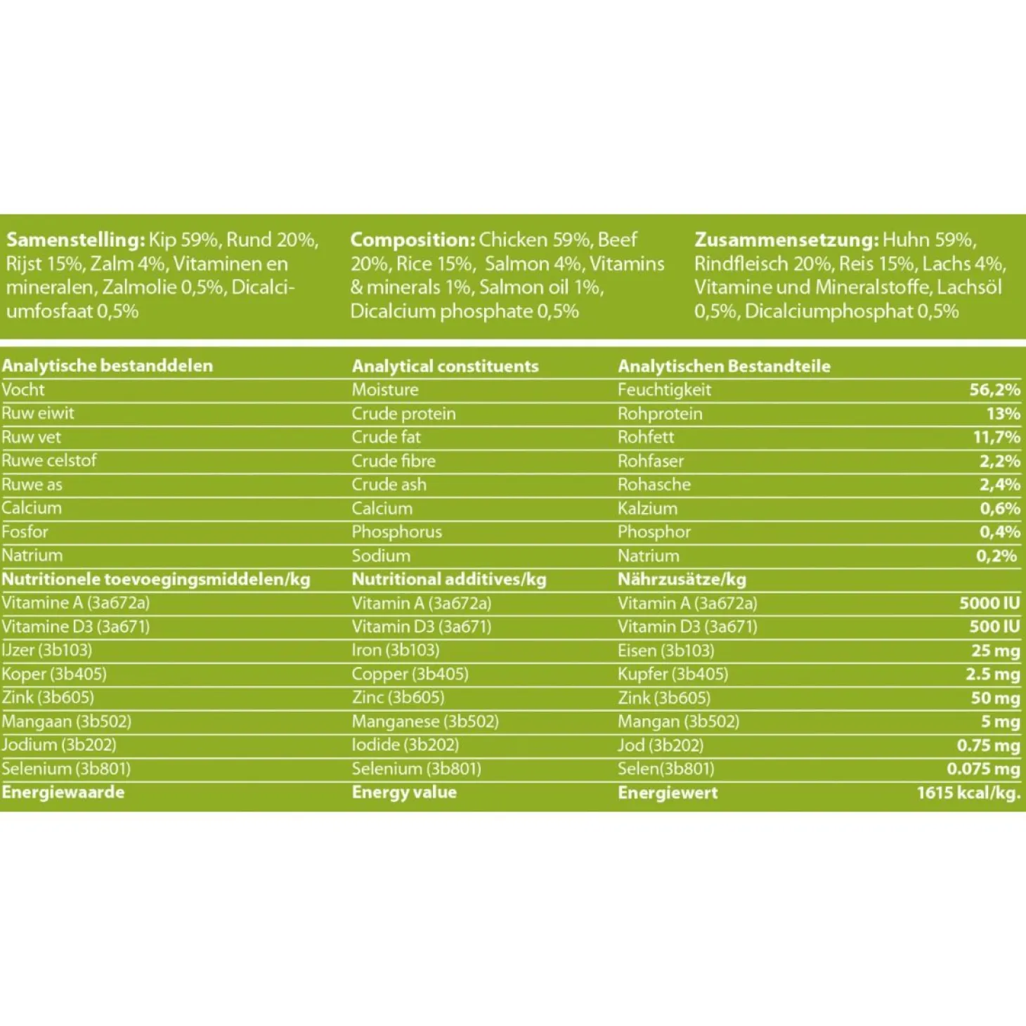 | Samenstelling | Kip 59%, Rund 20%, Rijst 15%, Zalm 4%, Vitaminen en mineralen, Zalmolie 0,5%, Dicalciumfosfaat 0,5%. |