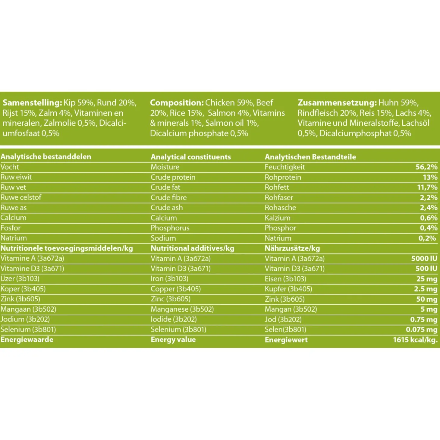 | Analyse | Ruw eiwit 13%, ruwe oliën en vetten 11,7%, ruwe celstof 2,2%, ruwe as 2,4%, calcium 0,6%, fosfor 0,4%, vocht 56,2%, energiewaarde 1615 kcal, vitamine A 5000 IU, vitamine D3 500 IU, ijzer 25 mg, jodium 0,75 mg, koper 2,5 mg, mangaan 5 mg, taurine 0,075 mg/kg, selenium 50 mg. |