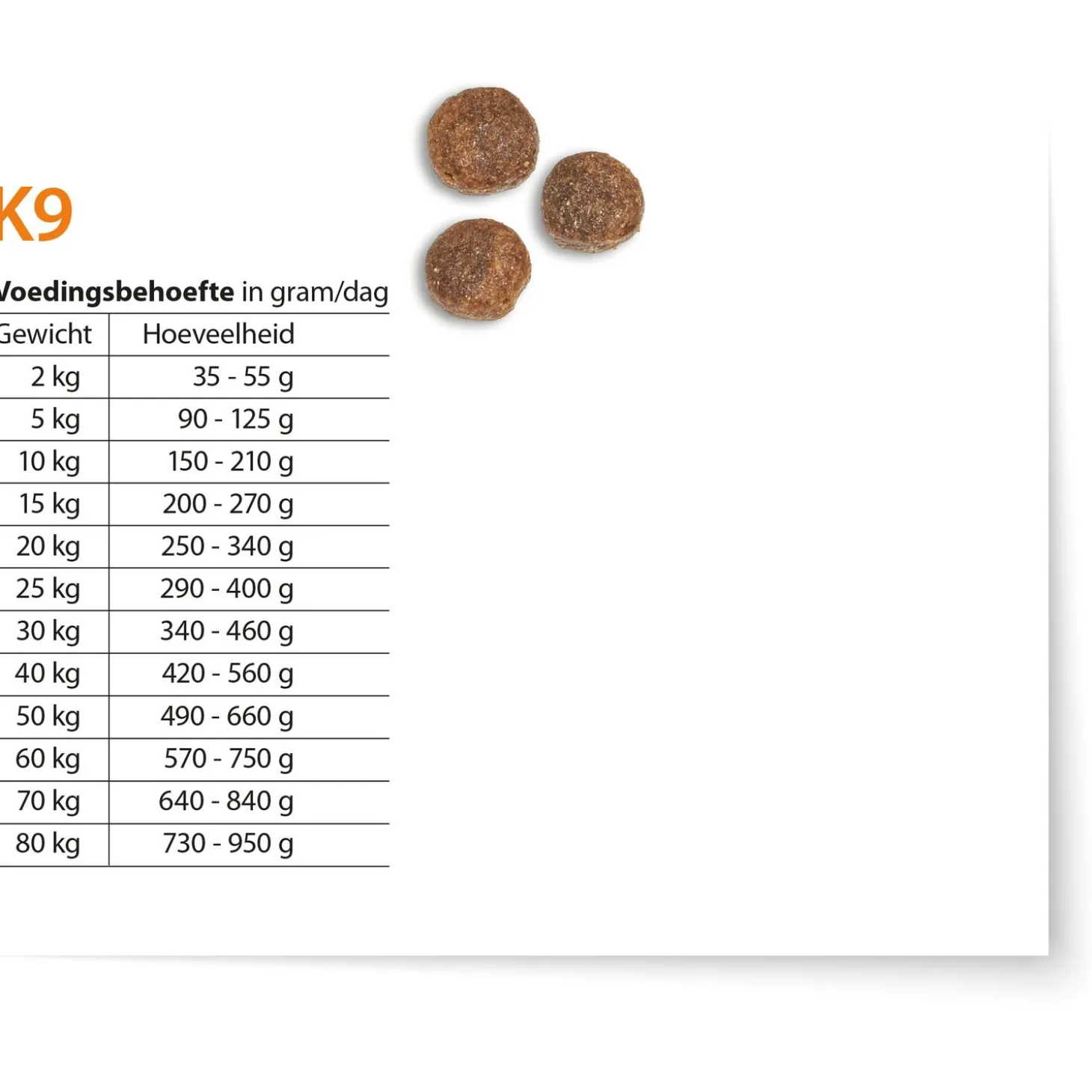 Regular K9 is een complete voeding met een hoge verteerbaarheid, zo worden de darmen optimaal ondersteund. Ook de huid en vacht van je viervoeter en zijn gebit zullen baat hebben bij deze brokken. Het voer bevat alle natuurlijke ingrediënten die je hond nodig heeft voor een fit en gezond lichaam met een sterke spiermassa. Natuurlijk is de voeding ook heel smakelijk waardoor jouw hond Regular K9 met plezier zal eten.