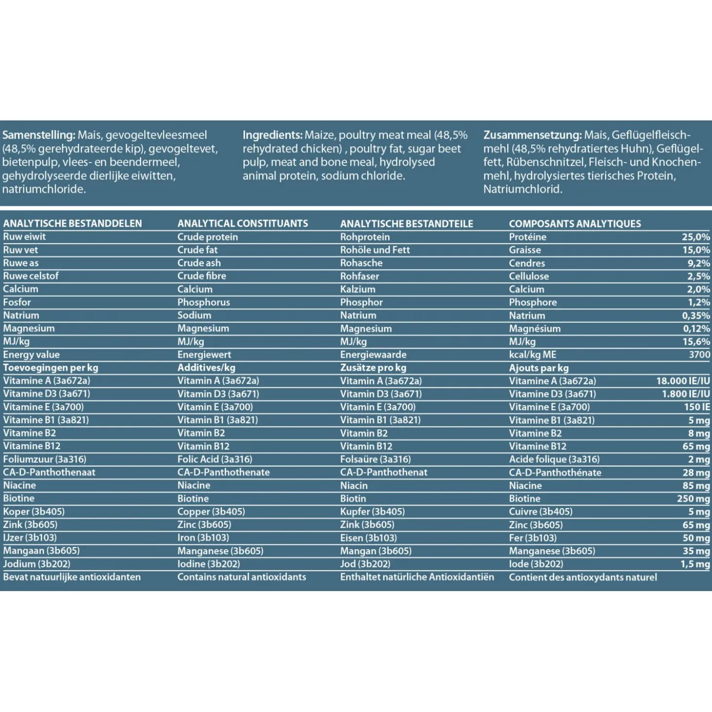 | Samenstelling | Mais, gevogeltevleesmeel (48,5% gerehydrateerde kip), gevogeltevet, bietenpulp,vlees- en beendermeel, gehydrolyseerde dierlijke eiwitten, natriumchloride. |