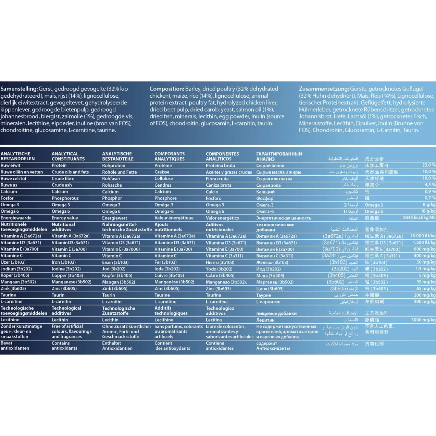| Samenstelling | Gerst, gedroogd gevogelte (32% kip gedehydrateerd), maïs, rijst (14%), lignocellulose, dierlijk eiwitextract, gevogeltevet, gehydrolyseerde kippenlever, gedroogde bietenpulp, gedroogd johannesbrood, biergist, zalmolie (1%), gedroogde vis, mineralen, lecithine, eipoeder, inuline (bron van FOS), chondroitine, glucosamine, L-carnitine, taurine. |