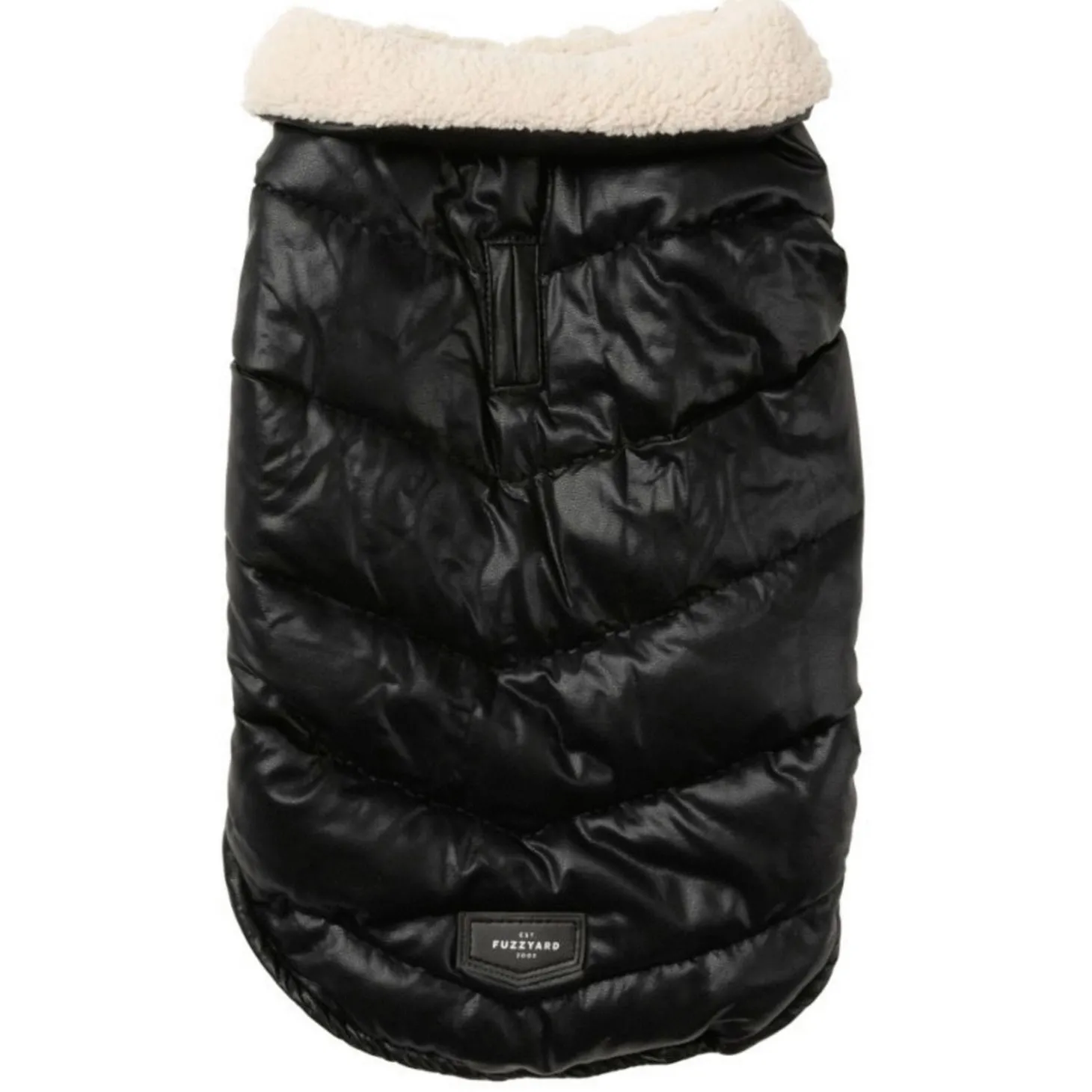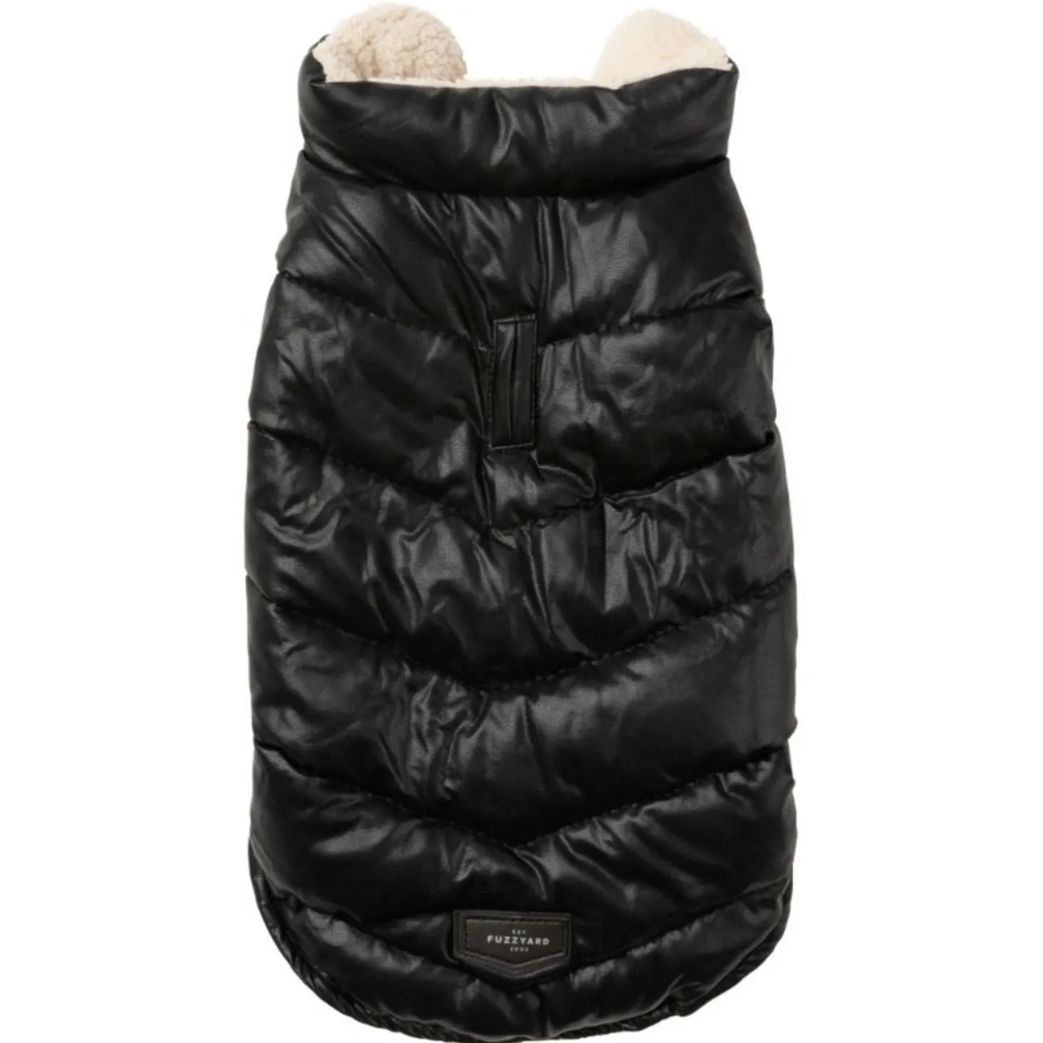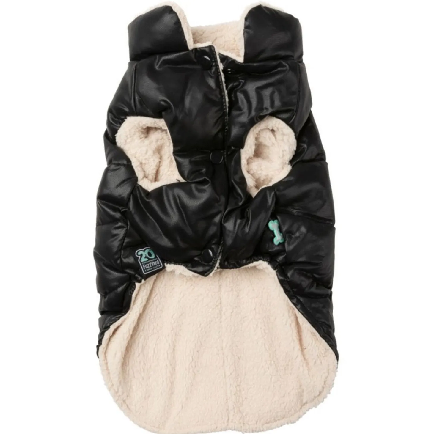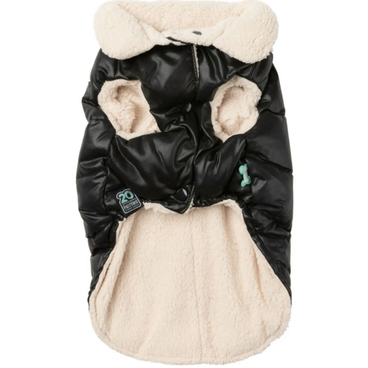 Met de FuzzYard Milano Jacket hoeft jouw viervoeter het nooit meer koud te hebben. Het stijlvolle pufferjack is zwart met leerlook aan de buitenkant met een zachte, beige voering van imitatie schapenvacht.