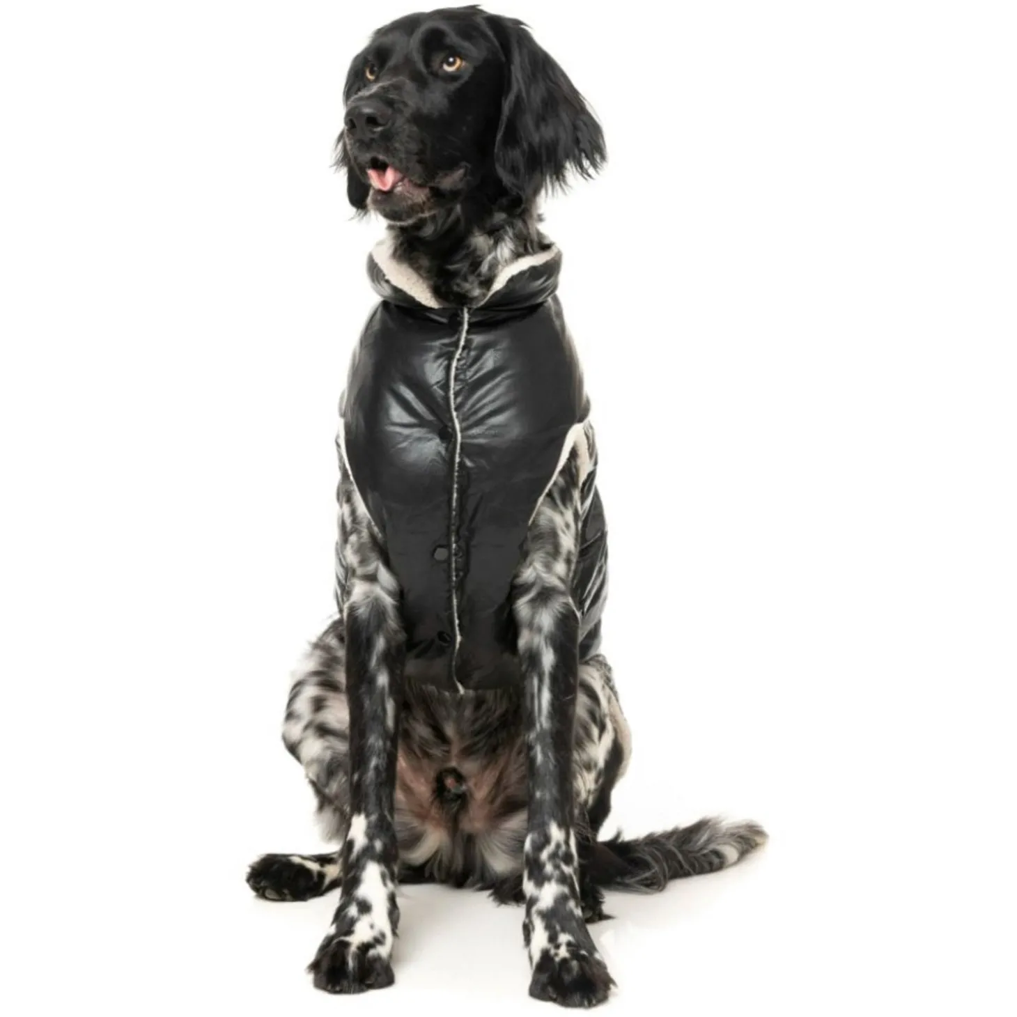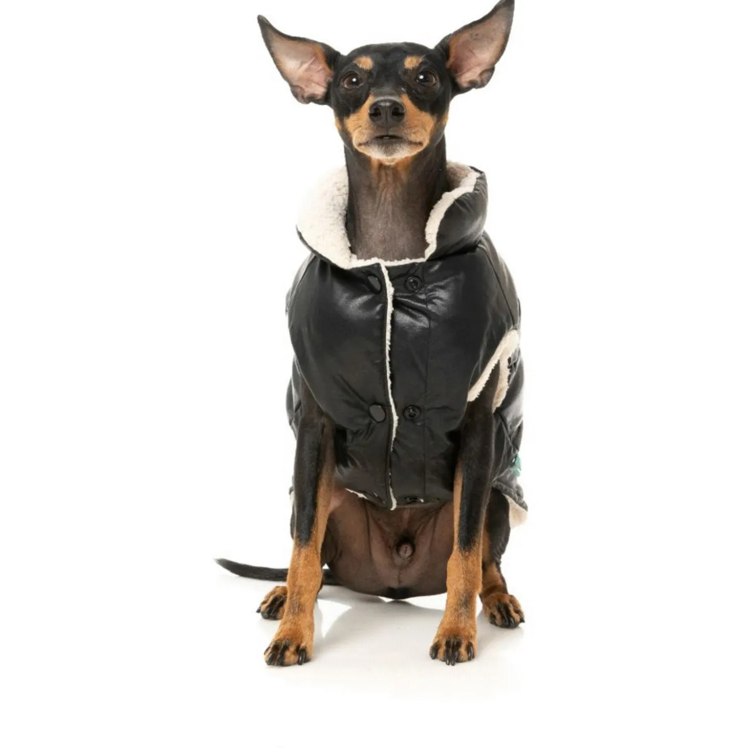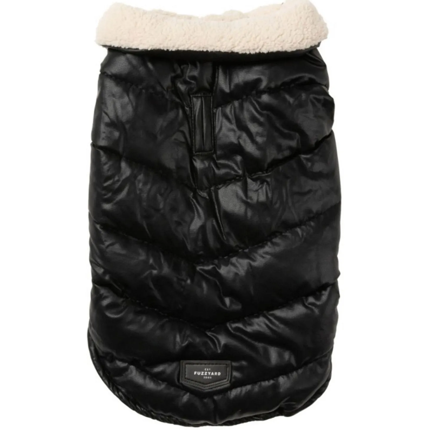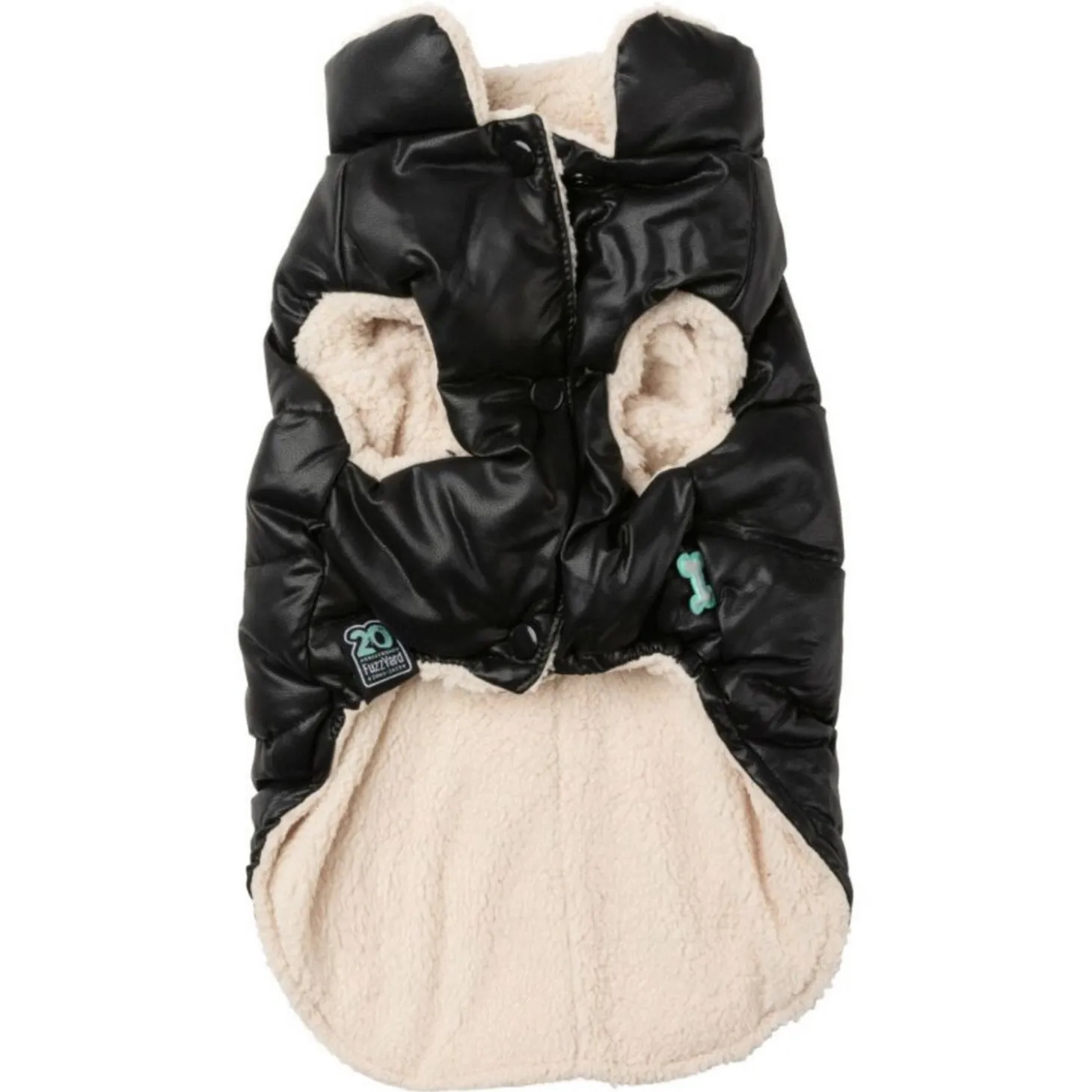Met de FuzzYard Milano Jacket hoeft jouw viervoeter het nooit meer koud te hebben. Het stijlvolle pufferjack is zwart met leerlook aan de buitenkant met een zachte, beige voering van imitatie schapenvacht.