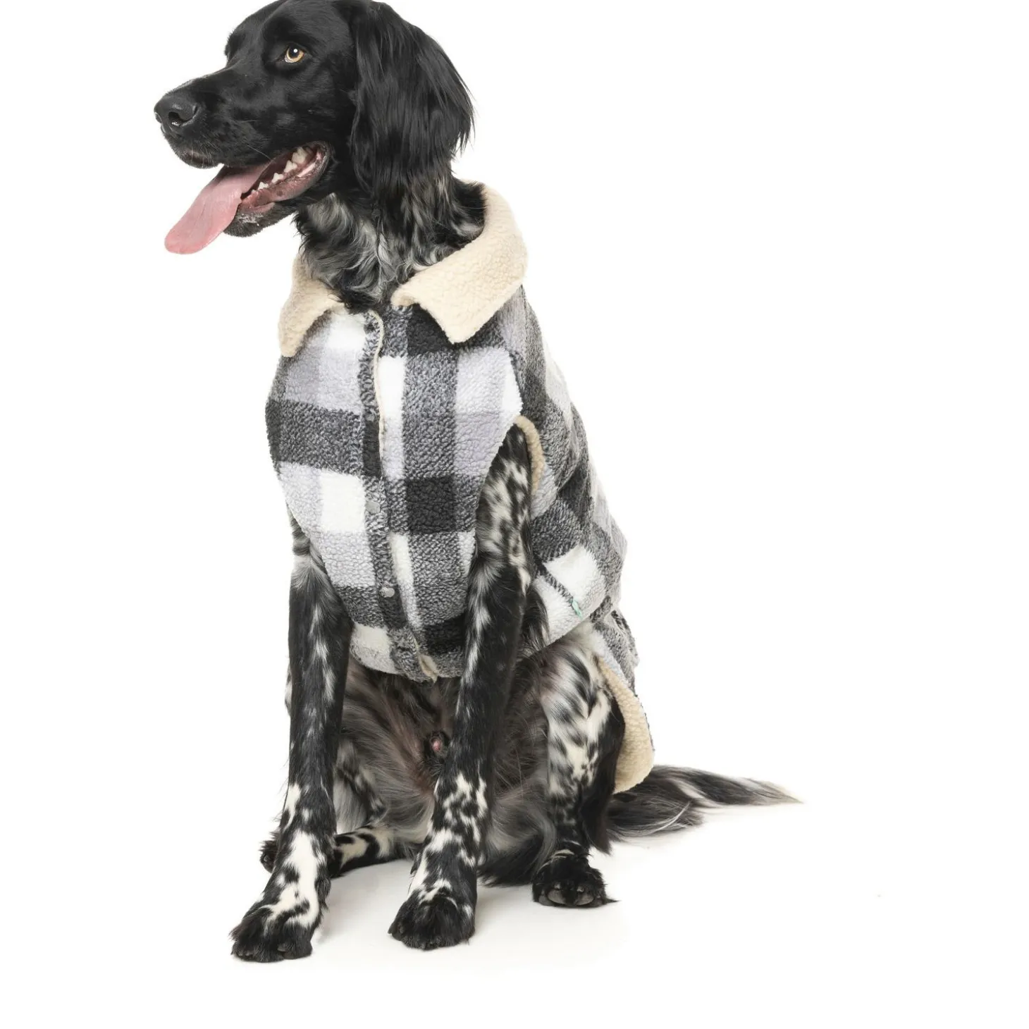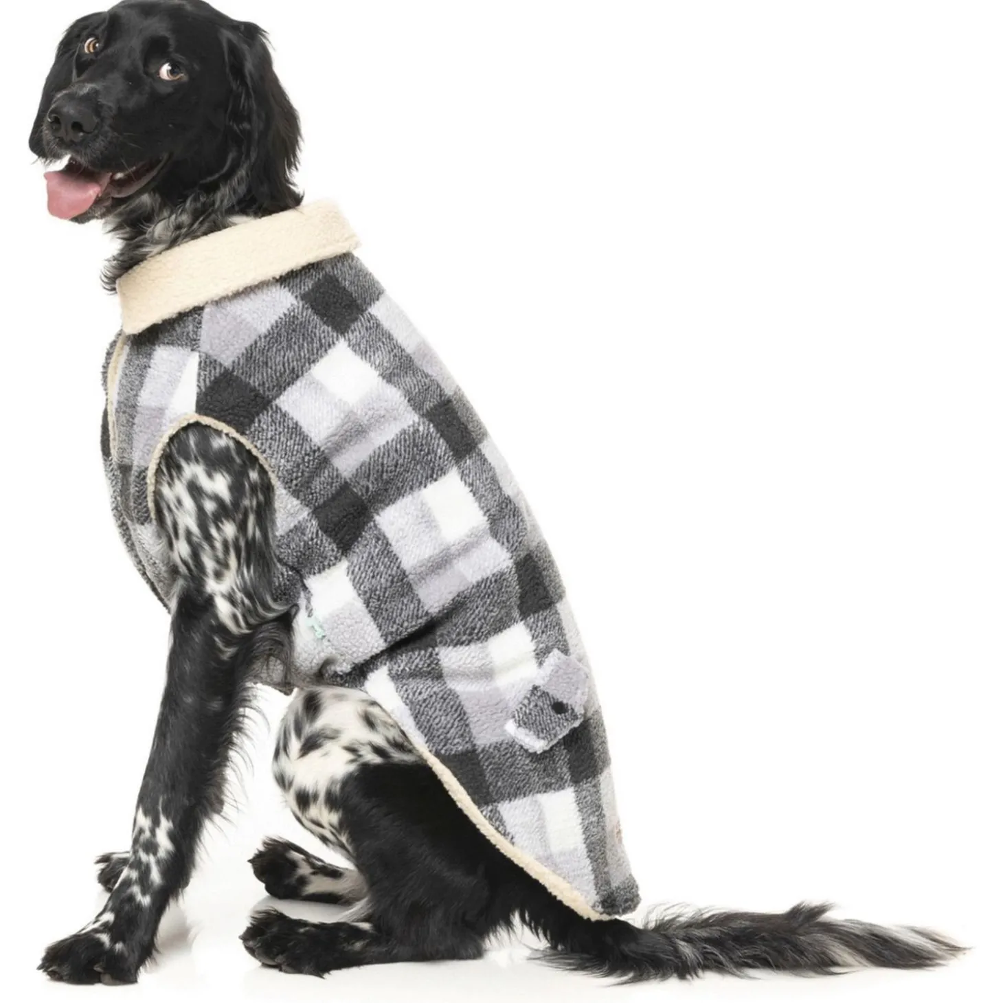 De jas is makkelijk aan te trekken met de drukknopen op de borst. The Lumberjack is gemaakt van klassiek flanel houthakkersfleece met een contrasterende beige nepbontvoering. Op de rug zit een opening waardoor je je looplijn kan vastmaken aan een eventueel tuig onder de jacket. De jas is verkrijgbaar in 7 maten. In de keuzeselectie wordt uitgegaan van de ruglengte.
