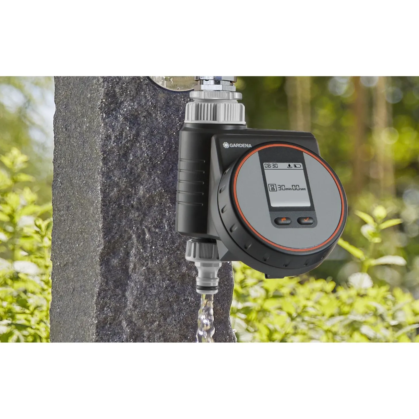 Het op batterijen werkende apparaat kan direct op de kraan worden aangesloten en kan worden bediend met een innovatieve, roterende knop. Met deze knop selecteer en bevestig je eenvoudig het gewenste programma.