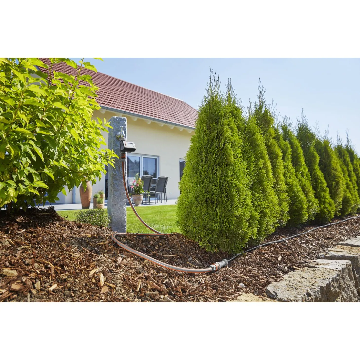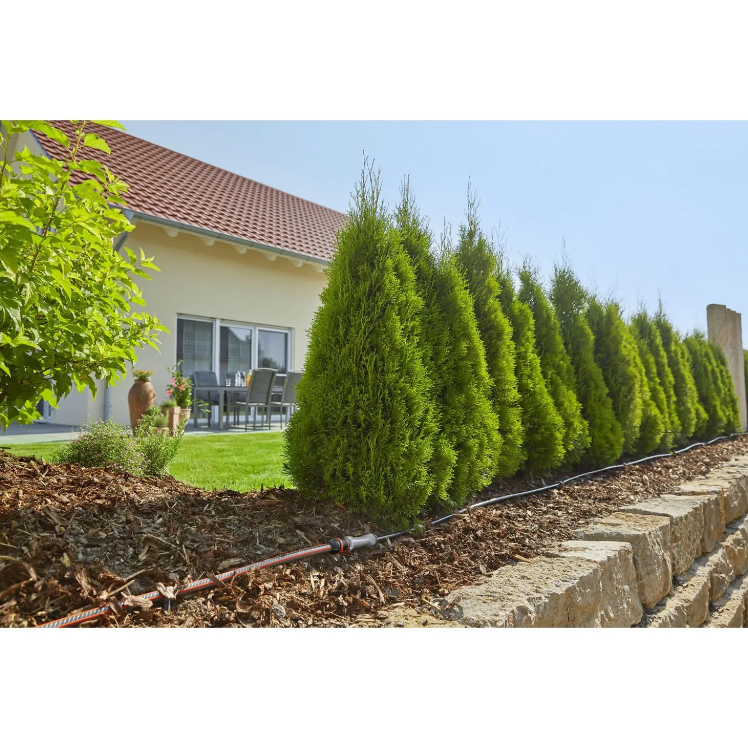 De drukreducerende Master-unit is via de slang aan te sluiten op de kraan. De druppelbuis is om de 30 cm uitgerust met zelfreinigende druppelaars voor een gelijkmatige besproeiing. Je kunt hiermee ongeveer 25 meter heg voorzien van water. De set kan worden uitgebreid tot 100 meter met de uitbreidingsset 13131-20.