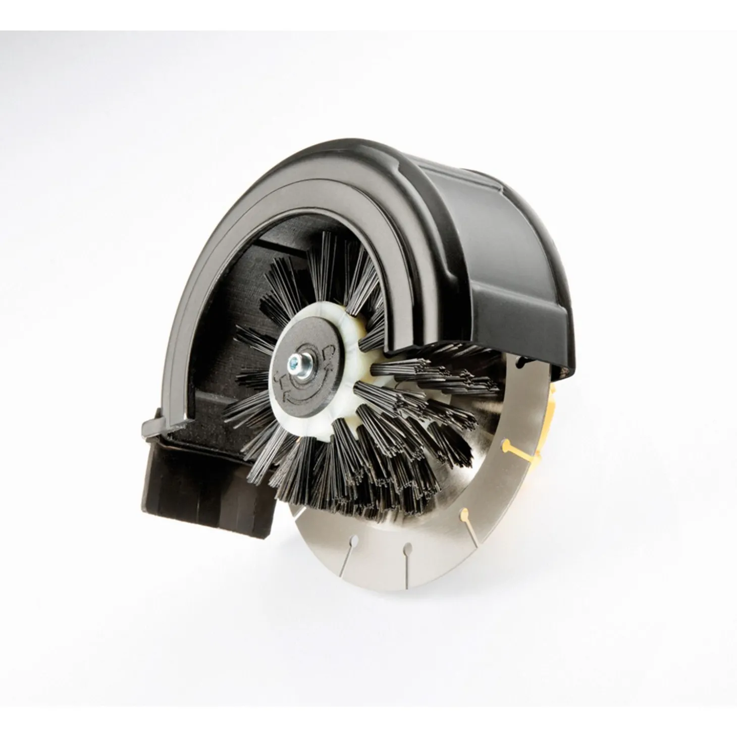 De 1 mm dunne, gegroefde roestvrij stalen schijf van het Cut&Brush-opzetstuk snijdt in de grond en tegelijkertijd ontdoet de 50 mm brede nylon borstel de stenen randen van overhangende graswortels.
