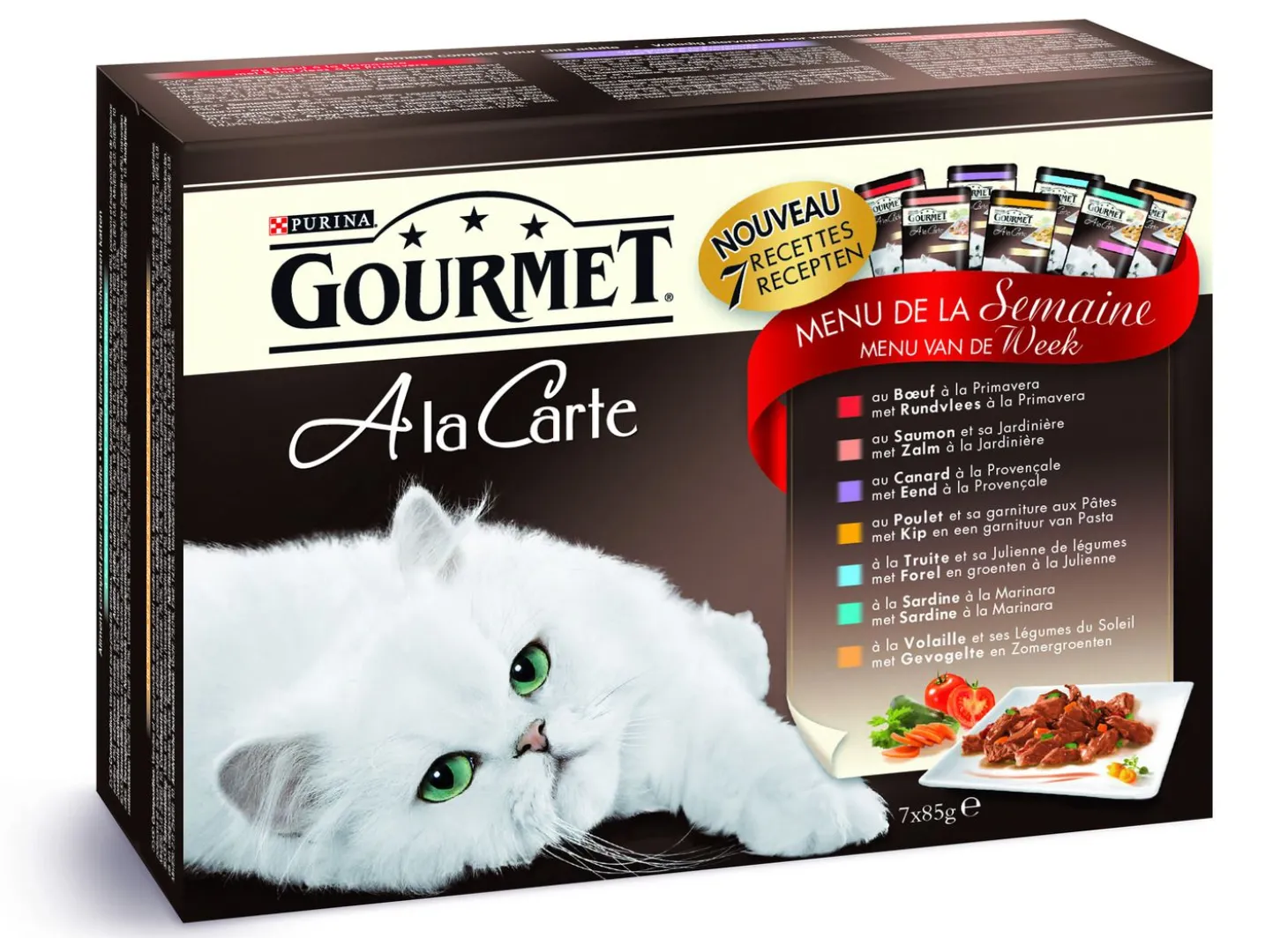 | Samenstelling | Zeven verschillende smaken:Rundvlees, zalm, eend, kip, forel, sardines en gevogelte. |