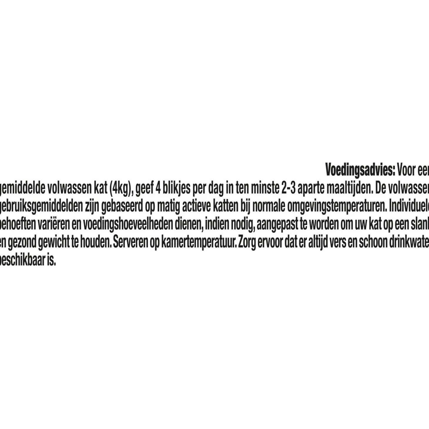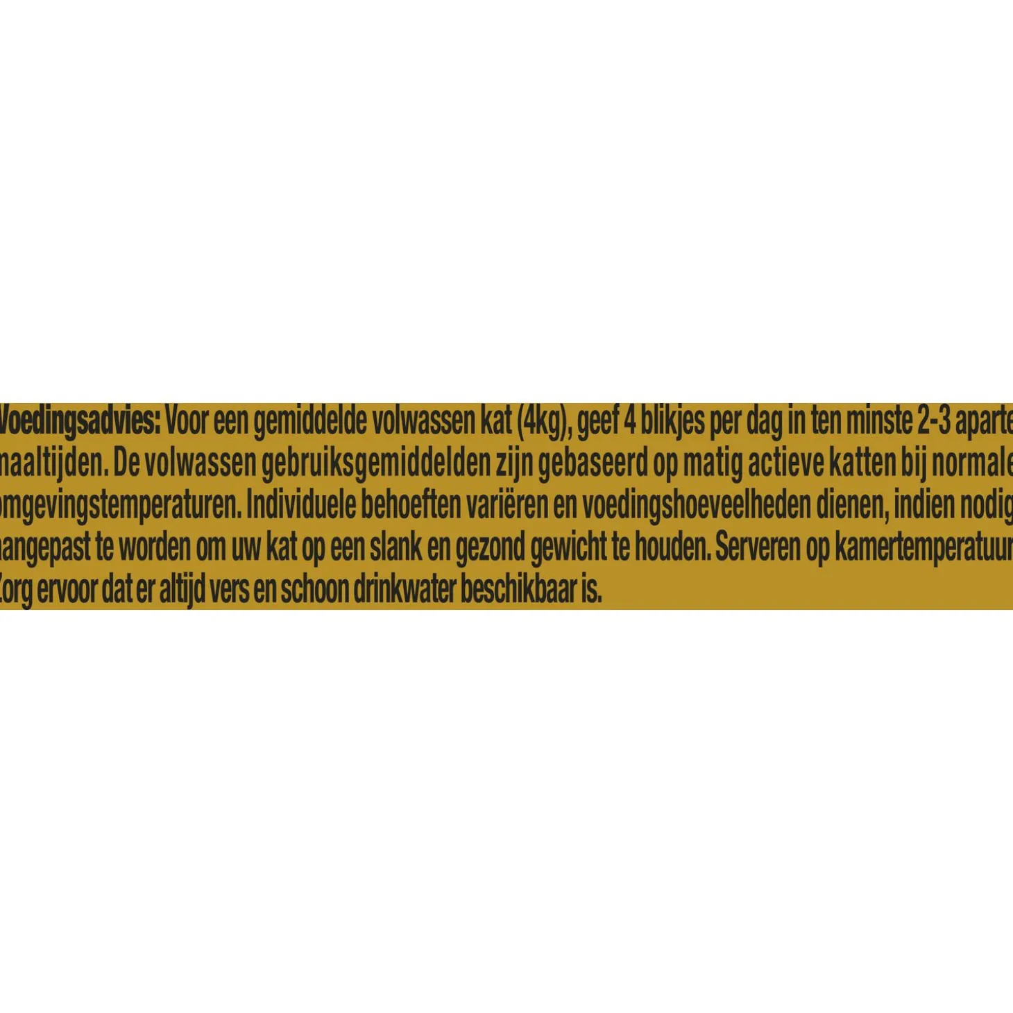 | Aanbeveling | Voor een gemiddelde volwassen kat (4kg), geef 4 blikjes per dag in ten minste 2 aparte maaltijden. De volwassen gebruiksgemiddelden zijn gebaseerd op matig actieve katten bij normale omgevingstemperaturen. Individuele behoeften variëren en voedingshoeveelheden dienen, indien nodig, aangepast te worden om uw kat op een slank en gezond gewicht te houden. Serveren op kamertemperatuur. Zorg ervoor dat uw kat altijd vers en schoon drinkwater tot zijn beschikking heeft. |