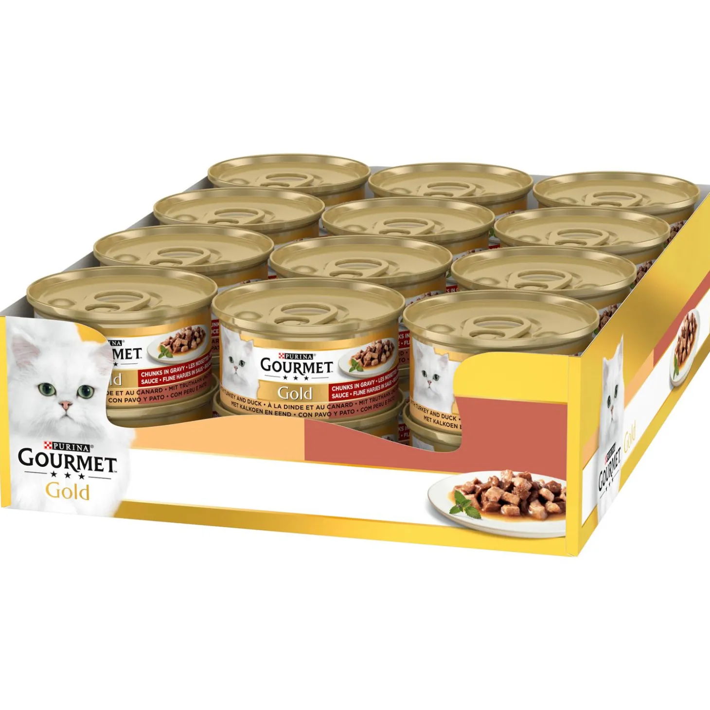 De Gourmet Gold Fijne Hapjes bevat 24 blikjes van elks 85 gram. In de Pets Place winkel zijn de blikjes per stuk te koop.