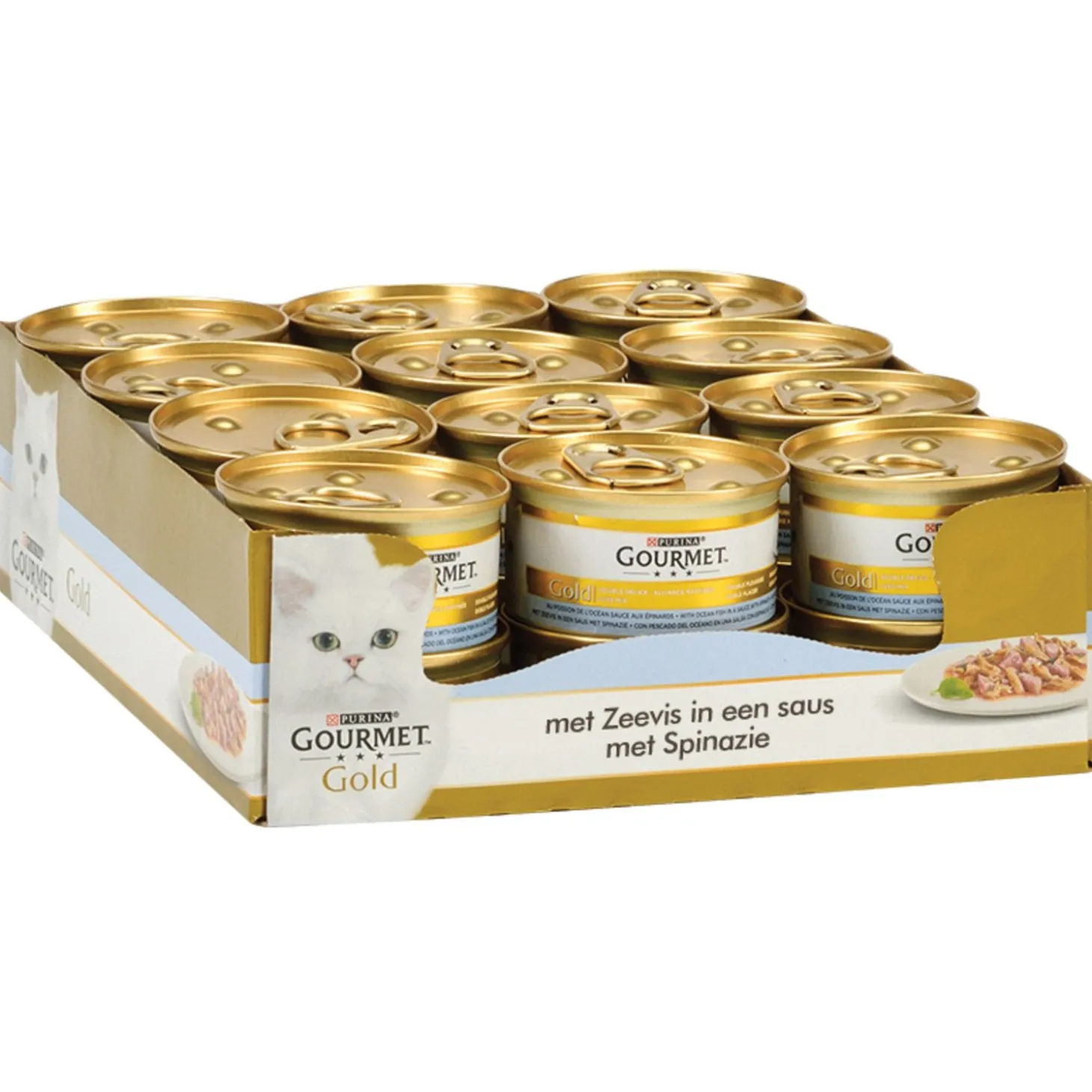De Gourmet Gold Luxe Mix bevat 24 blikjes van elks 85 gram. In de Pets Place winkel zijn de blikjes per stuk te koop.