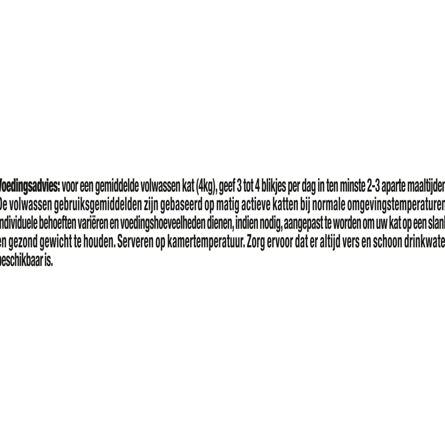 | Aanbeveling | Voor een gemiddelde volwassen kat (4kg), geef 4 blikjes per dag in ten minste 2 aparte maaltijden. De volwassen gebruiksgemiddelden zijn gebaseerd op matig actieve katten bij normale omgevingstemperaturen. Individuele behoeften variëren en voedingshoeveelheden dienen, indien nodig, aangepast te worden om uw kat op een slank en gezond gewicht te houden. Serveren op kamertemperatuur. Zorg ervoor dat uw kat altijd vers en schoon drinkwater tot zijn beschikking heeft. |